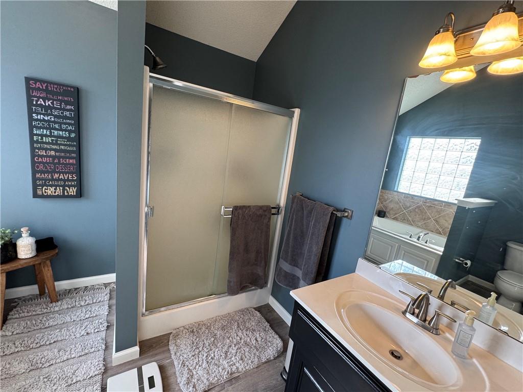 Welcome home to this beautifully maintained 3 bedroom, 2.5-bath residence offering space, style, and functionality throughout. The main level features soaring ceilings, abundant natural light, and a welcoming living room centered around a cozy fireplace- perfect for everyday living or entertaining. The kitchen is both stylish and functional with white cabinetry, granite countertops, stainless steel appliances, tile backsplash, and plenty of counter and storage space. The adjacent dining area opens to the deck, creating an easy flow for indoor-outdoor living. The spacious primary suite offers a peaceful retreat with a tray ceiling, generous closet space, and a private ensuite bath featuring a soaking tub and natural light from the glass block window. Two additional bedrooms and a full bath complete the main level. The finished lower level provides even more living space with a family room, second fireplace, half bath, and charming custom nook - ideal for a play area, or pet retreat. This level is perfect for movie nights, guests, or a home office setup. Enjoy the outdoors from the elevated deck overlooking the backyard, with stairs leading down to the patio- ideal for grilling, relaxing, or entertaining. Addition highlights include a 3-car garage, neutral color palette, and thoughtful finishes throughout. HOA amenities include a neighborhood pool, and a walking trail just steps away! This home is move-in ready with space to live, relax, and entertain- inside and out! Don't miss your chance to see this one in person.