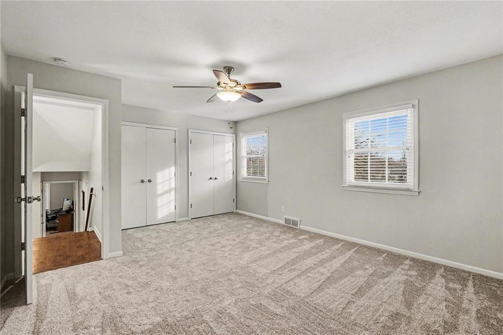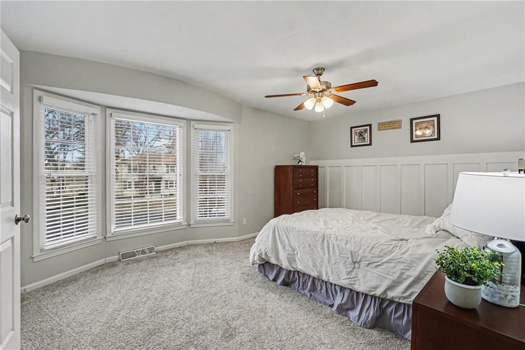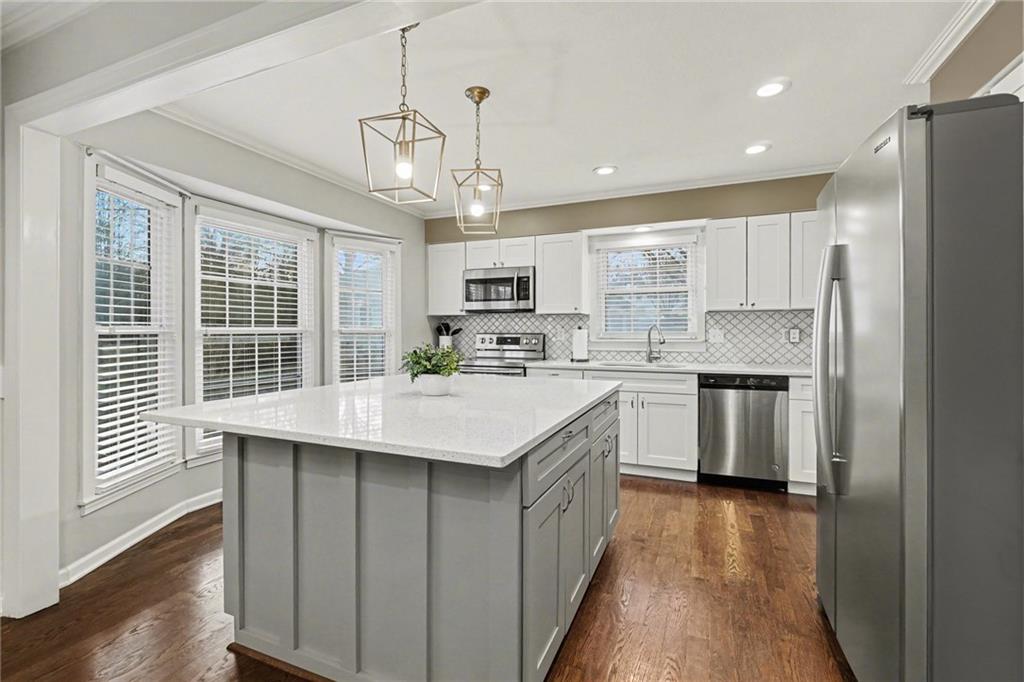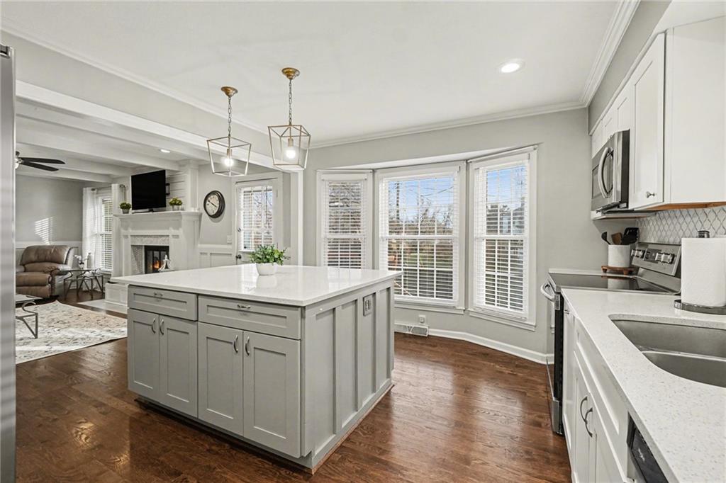 Move-in ready home featuring an open and functional layout with neutral finishes throughout. The updated kitchen offers white cabinetry, stainless steel appliances, quartz countertops, a large center island, and a bright bay window—perfect for everyday living and entertaining. Hardwood floors flow into the inviting living room highlighted by a fireplace and built-ins. The primary suite includes a private ensuite bath and spacious walk-in closet. Additional bedrooms offer flexibility for guests, a home office, or hobby space. Enjoy outdoor living on the elevated deck overlooking the fenced backyard, complete with patio space and mature trees for added privacy. Convenient layout, tasteful updates, and multiple living areas make this home a must-see.