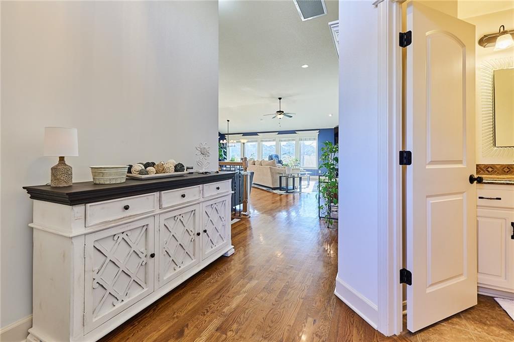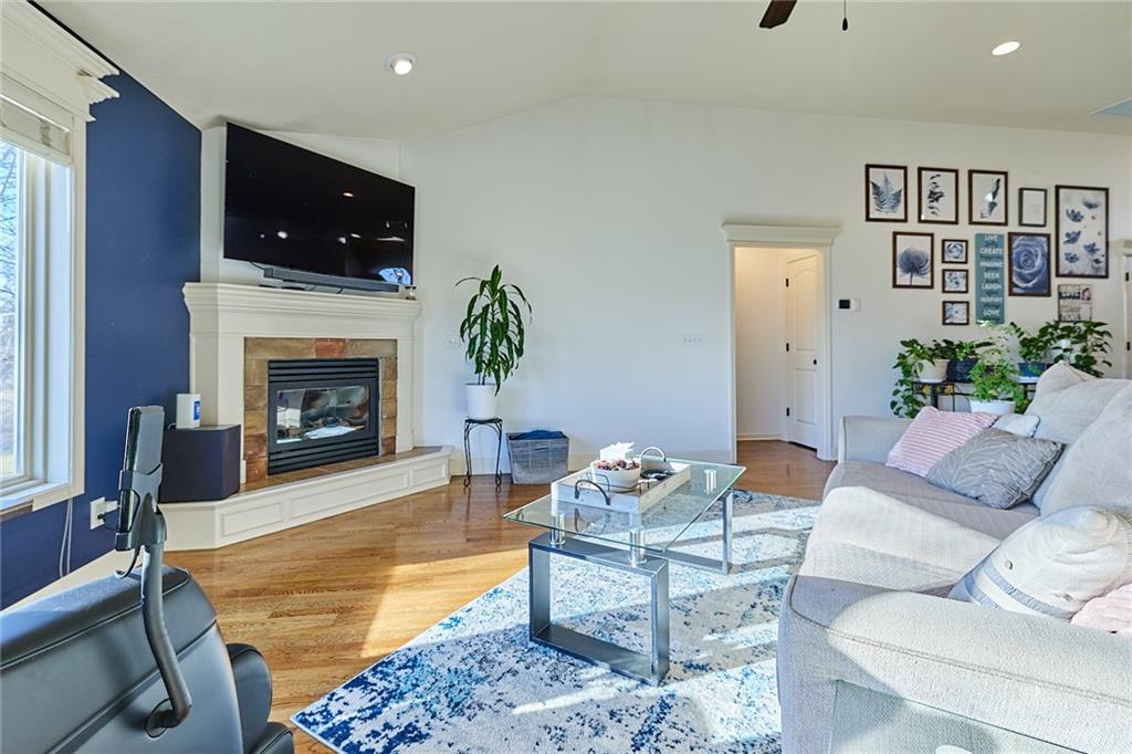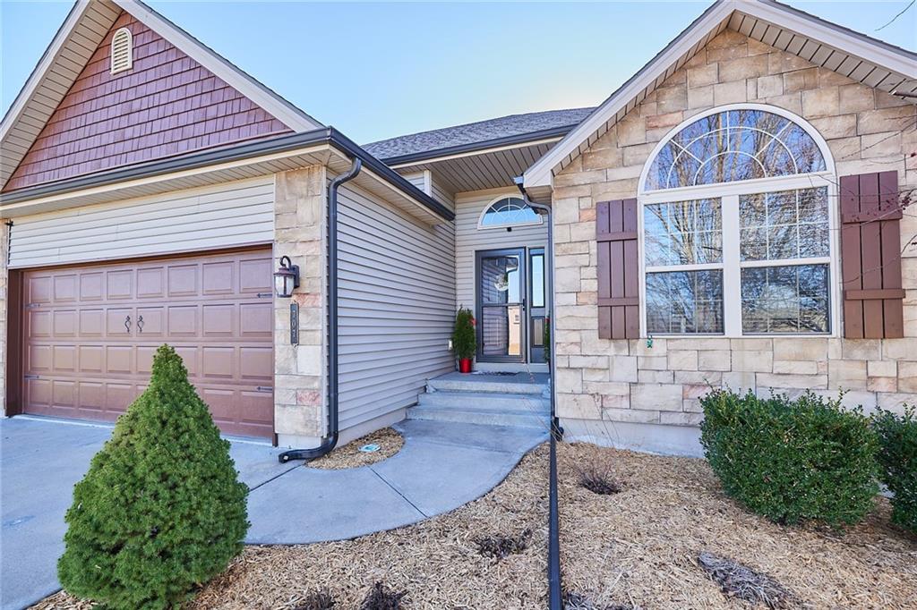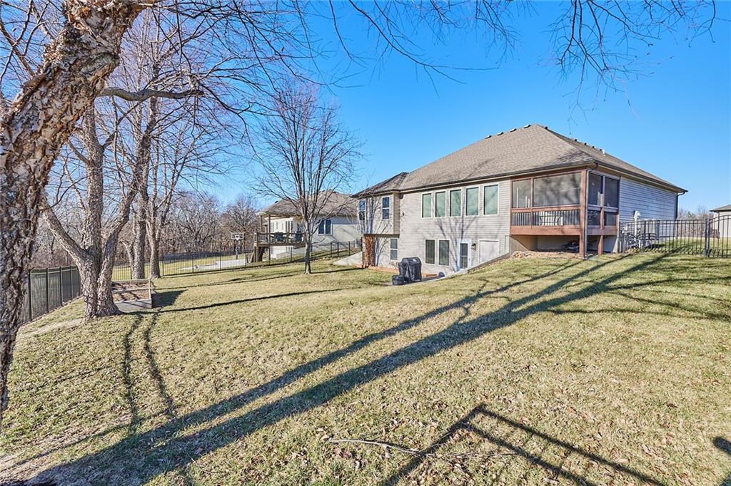 Welcome home to 707 Tomahawk Court! This immaculate, elevated reverse 1.5-story home in desirable Greyhawke at the Lake offers tasteful upgrades, warmth, and exceptional privacy, backing to acres of beautiful open green space. The open-concept floor plan is designed for effortless living with true main-level living. Interior highlights include hardwood floors, a spacious living room with vaulted ceilings, a cozy corner fireplace, and a stunning wall of windows that fills the home with natural light while bringing the outdoors in. The gourmet kitchen features custom cabinetry, granite countertops, a large island, big walk-in pantry, and new stainless steel appliances. The main-level primary suite provides a peaceful retreat with oversized windows, a whirlpool tub, and a generous walk-in closet. There is another bedroom with views off the front of the home and a full bathroom on the main level offering plenty of versatility. The finished walk-out basement expands the living space with a large family room featuring a fireplace and wet bar, two additional bedrooms, and a versatile bonus room ideal as a non-conforming fifth bedroom, office, game room, storage area or flex space. Step outside to enjoy the private screened-in deck overlooking serene green space perfect for relaxing or entertaining. The large, fully fenced backyard offers plenty of room to play and includes a separate utility door entrance for pets. Additional features and upgrades include an in-ground sprinkler system, new carpet, fresh interior and exterior paint, a new tankless water heater, new attic fan, new HVAC and air conditioning unit, and new appliances. All of this is conveniently located just minutes from Smithville Lake, Paradise Pointe Golf Course, the marina, walking trails, Crows Creek Campground, wineries, coffee shops, restaurants and the charming downtown square of Smithville. Top rated school district is a huge bonus!
