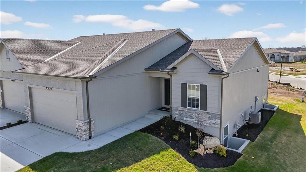Currently a VACANT LOT — please tour the model home at 25039 W. 94th Terrace for floor plan reference and standard finishes. The Lakewood III by Lambie Homes is a thoughtfully designed 3-bedroom, 2-bathroom villa with a bonus flex space, offering 1,580 square feet of one-level, on-slab living in the maintenance-provided Mize Hill community. This new floor plan delivers open, functional living with 9-foot ceilings, an inviting great room, and a flexible bonus space ideal for a home office, hobby room, or additional sitting area. The kitchen flows seamlessly into the dining and living areas, designed for everyday comfort and easy entertaining. Standard features include quartz countertops, covered patio, 50-gallon water heater, black door lever hardware and hinges, and quality craftsmanship throughout. The primary suite and secondary bedrooms are thoughtfully positioned to maximize privacy and functionality, all on a single level with no stairs. Residents of Mize Hill enjoy planned community amenities including walking trails, a future pool, and close proximity to Cedar Station Park and Mize Lake, offering a lifestyle centered around convenience, low maintenance, and outdoor enjoyment. This home is currently in the permitting stage with the City of Lenexa. Estimated completion is Septemeber/October 2026. Pricing reflects base pricing for this floor plan. Photos are of a model home or similar floor plan and may depict upgrades, finishes, or features not included in this property. Colors, materials, specifications, pricing, and completion timelines are subject to change at builder’s discretion. Contact community agent for additional details and availability.