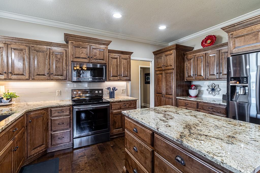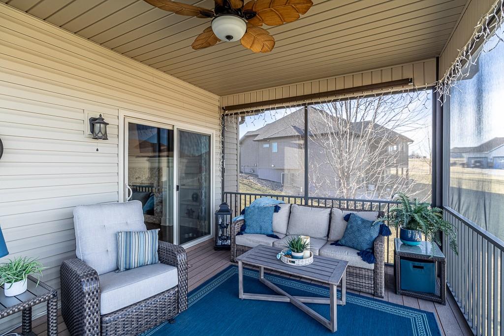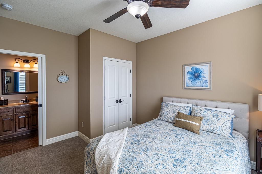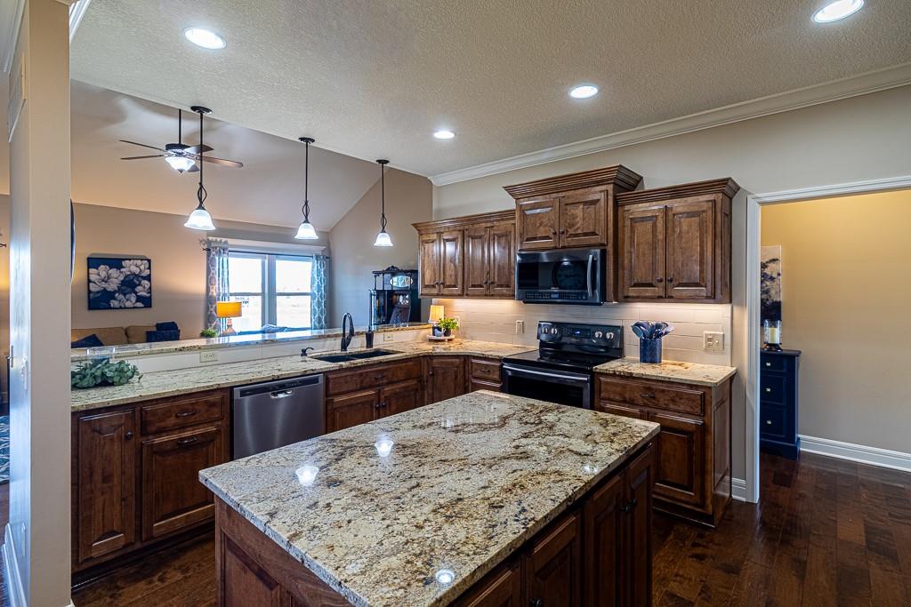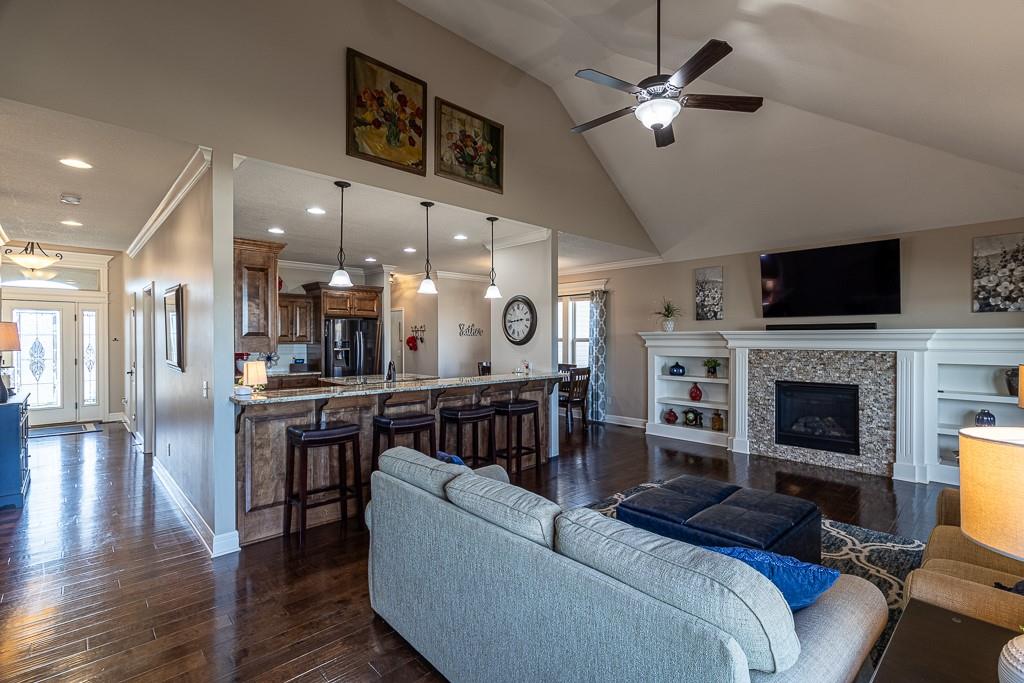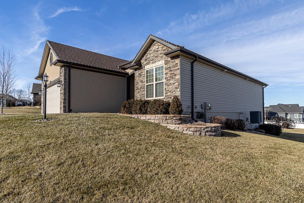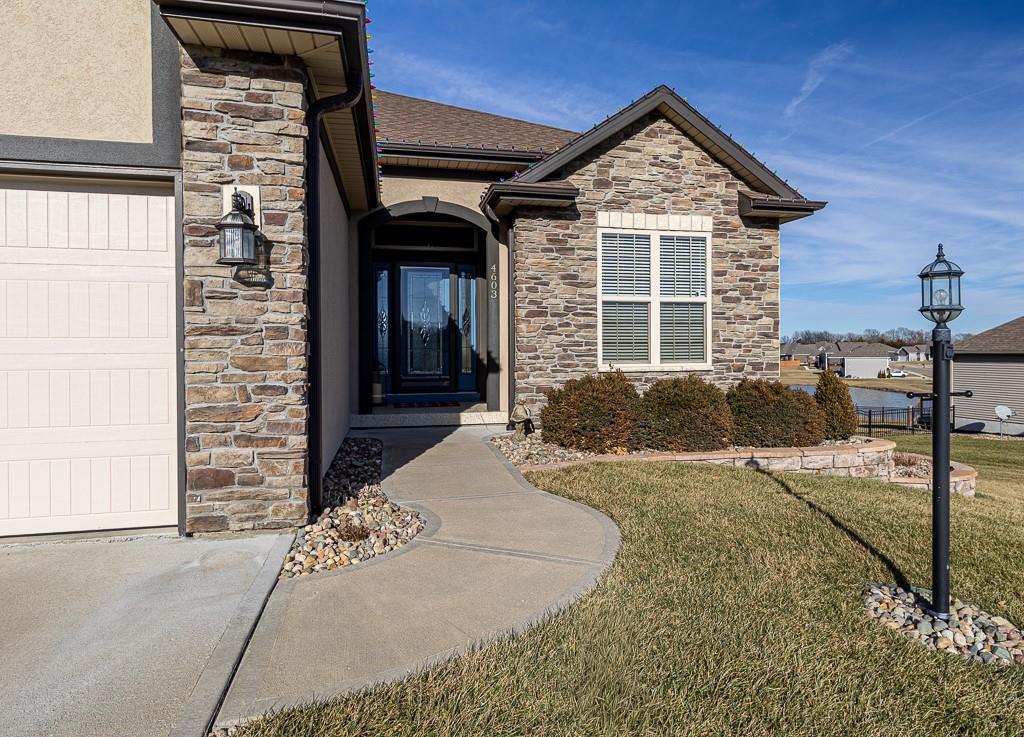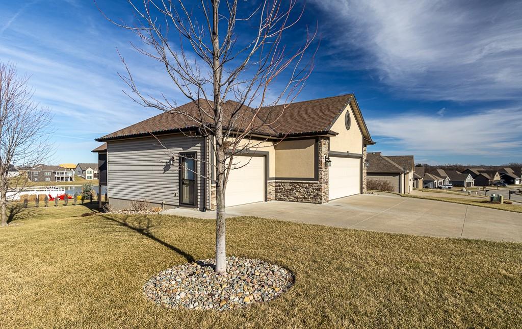 Attention Greystone Buyers!! This immaculate 4 bedroom reverse 1 1/2 story has it all! Beautifully maintained, custom built one owner home features warm wood flooring, upgraded kitchen with large island, stained cabinetry with roll out shelving, deep drawers, pantry and stainless appliances, including refrigerator. The open floor plan is ideal for entertaining or everyday living. The spacious great room is highlighted by an attractive gas fireplace and built-in book cases, tall ceiling and access to the screened deck. Be sure to check out the view of the association pond and common grounds from the deck and patio. The primary suite includes a large bedroom plus walk-in closet, double vanity and attractive tiled shower. Also conveniently located on the main level is the 2nd bedroom, laundry room (washer & dryer stay) and a 3 car attached garage. The tastefully finished lower level boasts a well lighted family room that includes a kitchenette, 2 additional bedrooms, 3/4 bath and storage room. Easy access to the expanded patio from the family room for additional enjoyment. Additional improvements & upgrades: Garage floor & front stoop epoxy finish, humidifier on the furnace, lawn irrigation system, water softener, garage cabinets added, professional landscaping. Better check this one out before it's sold! (portable shelving in storage room, slat tool racks & refrigerator in garage do not stay)