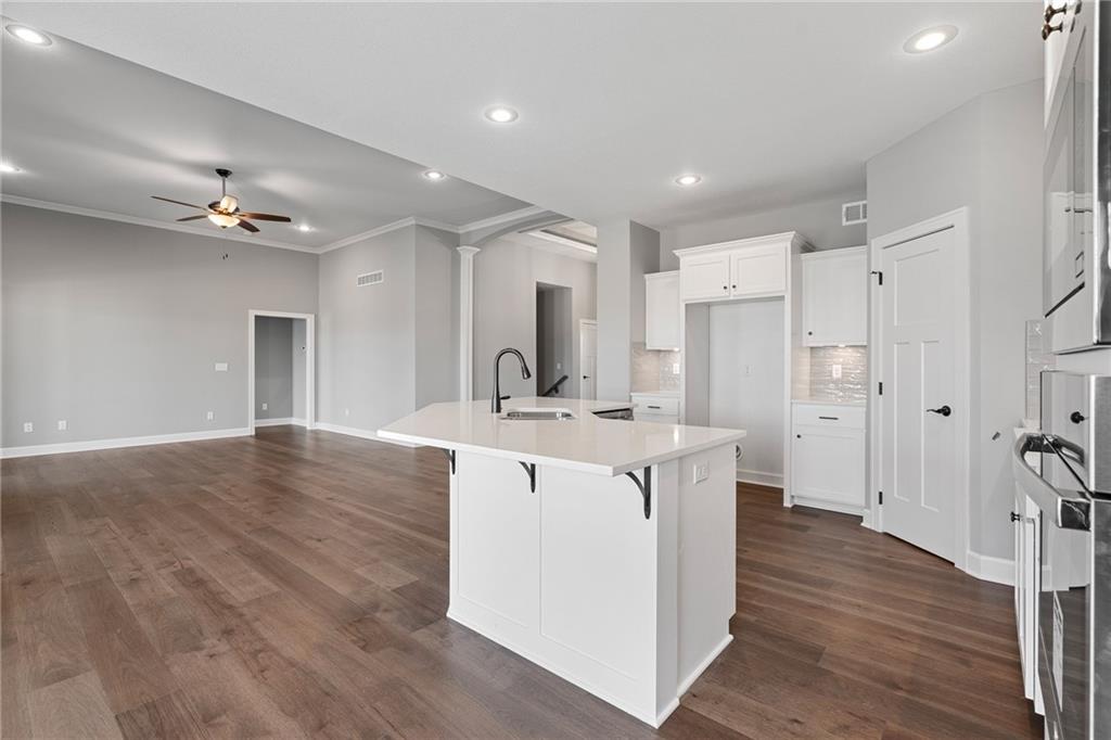 Welcome to Sara’s Meadow, an exciting new subdivision and home to The Drake by Hoffmann Custom Homes — a beautifully designed Reverse 1.5 Story that blends warmth, modern style, and smart construction. From the moment you walk in, this home is filled with natural light, soaring ceilings, and refined finishes throughout. The main level features gorgeous dark colored engineered hardwood floors and a chef-inspired kitchen showcasing light, light granite countertops, dark hardware, a gas cooktop and wall oven, enameled cabinetry, and under-cabinet lighting that makes the space shine — perfect for those who love to entertain! The great room is anchored by an eye-catching gray stone fireplace with enameled wood trim accents and opens seamlessly to the covered deck, ideal for relaxing. The main-level owner’s suite truly feels like a private retreat with a freestanding soaker tub, double vanities, and a generous walk-in closet. A second bedroom on the main floor makes the perfect nursery, home office, or guest space, along with a full bath and a conveniently located laundry room. Downstairs, the finished walkout lower level adds even more space with two additional bedrooms, a full bath, and a spacious rec room complete with a granite wet bar — plus walkout access to a covered patio and an oversized backyard that feels both peaceful and private. Thoughtfully engineered for modern living, this home includes 2x6 exterior wall construction, is prewired for solar panels, offers EV charger compatibility, energy-saving features, and comes backed by a 10-year structural warranty. If you’ve been waiting for the perfect blend of style, quality, luxury, comfort, and location — you need to come experience “The Drake” in Sara’s Meadow. This one is a showstopper!