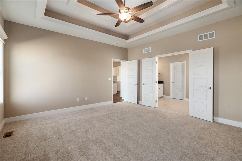 Welcome to Sara’s Meadow, an exciting new community where fresh construction meets timeless style. Introducing The Jordan by Hoffmann Custom Homes — a new gorgeous ranch style reverse 1.5 Story offering 4 bedrooms, 3 full baths, and a finished lower level, all wrapped in quality craftsmanship and smart modern design Step inside and you’ll immediately notice the difference — sunlight pouring in, soaring ceilings, and refined finishes that feel both elevated and welcoming. The main level is designed for effortless living and entertaining with rich espresso-toned engineered hardwood floors and a standout kitchen featuring black granite countertops, polished nickel finishes, a gas cooktop and wall oven, enameled cabinetry, under-cabinet lighting, and a walk-in pantry you’ll love! The spacious great room is warm and inviting, centered around a striking stone and wood fireplace that makes a statement without trying too hard. Your main-level owner’s suite is the retreat you’ve been waiting for — complete with a freestanding soaker tub, double vanities, a beautiful marble-style tiled shower, and a generous walk-in closet. Downstairs, the finished lower level adds room to spread out with an additional bedroom, full bath, and an oversized rec room with a wet bar — perfect for game nights, hosting guests, or creating your dream hangout space. Built for long-term comfort and efficiency, this home includes 2x6 exterior wall construction, is prewired for solar, offers EV charger compatibility, energy-saving upgrades, and is backed by a 10-year structural warranty for peace of mind. All of this is tucked inside the Staley High School attendance area, just minutes from city conveniences — yet still offering that “quiet country feel” everyone wants. Come experience The Jordan in Sara’s Meadow, you won't be disappointed!