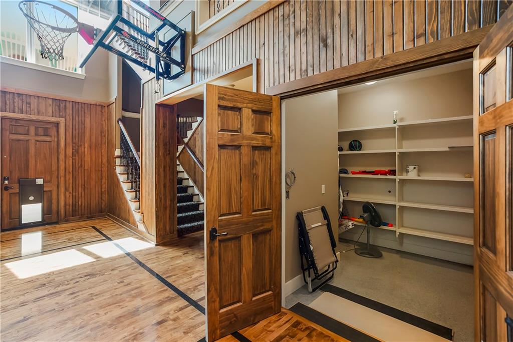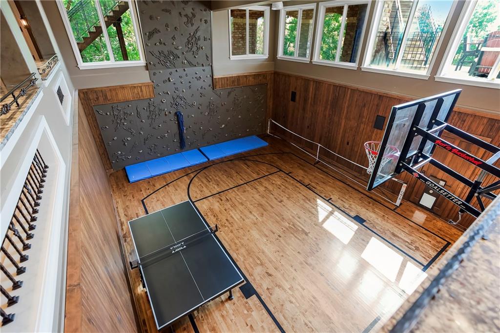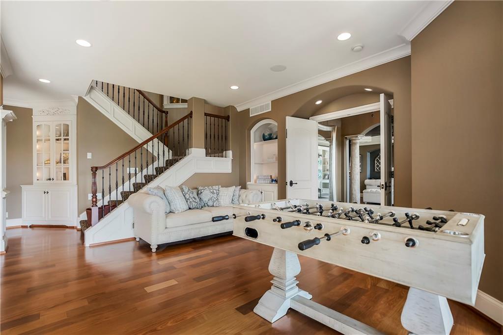 Incomparable custom home designed by Scott Bickford & meticulously built by Charles Kraft. Spectacular views of Shadow Lake & long vista's overlooking the Cedar Creek valley! Recent updates include a completely modernized theater room, new light fixtures & electronics. This phenomenal 5 level property features extensive Brazilian cherry hardwood floors & extensive heated floors as well! Main floor includes a stunning 2-sty Great rm. w/FP, formal dining, Den w/FP, spacious guest suite & casual dining. Dream kitchen features 3 Gaggenau ovens, separate wood front Bosch fridge & freezer, huge walk-in pantry & mud room, twin GE Profile DW's & a 6-burner gas Dacor range! 2nd floor features a spectacular primary suite w/marble bath & FP, custom walk-in shower, expansive walk-in closet, exercise rm., sitting rm., w/adjoining covered deck. Built-ins include a dry-cleaning unit, mini fridge, DW, microwave & make-up vanity w/sink! Three spacious bedrooms all w/private baths & walk-in closets share a versatile loft space. The 3rd floor boasts a large recreation/game rm. & home office, both enjoy the most dramatic views! The finished walkout LL begins with a large Family rm w/stone FP, walk-behind wet bar w/triple Sub Zero fridge/freezer/wine cooler, Meile beverage center, Game rm, 2 additional guest bdrms., full bath, walk-in safe rm & a 22 x 19 tiered Home Theater retreat! Basement level 30' x 25' indoor basketball court w/20 ft. ceilings & climbing wall, which could also be utilized as a golf simulator space, 1/2 pickleball or volleyball court! Over 1,000 sq ft of outdoor paver brick & stained concrete patio space, covered outdoor kitchen & deck w/FP, & plenty of backyard space w/infrastructure in-place to add a swimming pool. Tile roof, circle driveway, exterior constructed with a mix of 100-year-old Coffeyville brick & native limestone. Note: Potential option to enroll children in the Olathe School District if preferred & also close proximity to St. James high school.