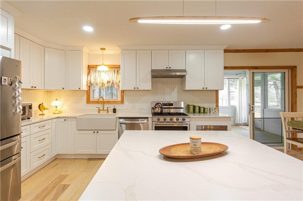 Tucked away on a quiet cul-de-sac just outside the city limits, this beautifully remodeled 3-bedroom, 2-bath residence sits on 1.9 acres in a highly desirable neighborhood and features a convenient circle drive for easy access and parking. Thoughtfully transformed from top to bottom. Inside, beautiful hardwood floors flow throughout much of the home, complimented by quartz countertops and a designer kitchen ideal for both daily living and entertaining. The kitchen showcases a farmhouse-style sink, a statement island with seating, and comes fully equipped with a refrigerator, gas range, exhaust hood, dishwasher, and built-in microwave, making it truly move-in ready. The inviting living area is anchored by a gas-insert brick fireplace, while the expansive sunroom, lined with windows and accented by a ceiling fan, offers a tranquil retreat and steps directly out to the patio and the chain-link fenced area, creating an effortless indoor-outdoor connection ideal for entertaining, kids, or pets. The primary suite offers a private retreat with a spa-inspired walk-in shower featuring a luxurious rain showerhead. A full unfinished basement provides exceptional storage or the opportunity for future living space. Outdoors, enjoy a spacious yard, the fenced area perfect for children or animals, a newly built pergola-style covered front deck finished with low-maintenance composite decking and bonfire area. Designed for relaxation, the deck features a full porch swing and two additional swings, creating the perfect setting for morning coffee or evening unwinding. Additional features include a 1-car attached garage and a detached 12x16 garage/outbuilding with concrete flooring, walk-in door, and garage door—ideal for a workshop or extra parking. This exceptional property offers refined upgrades, privacy, and convenient access to town.