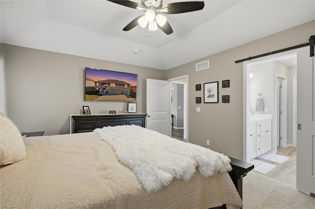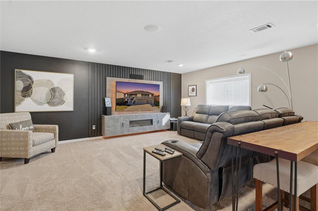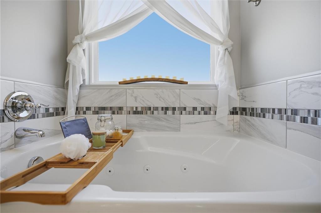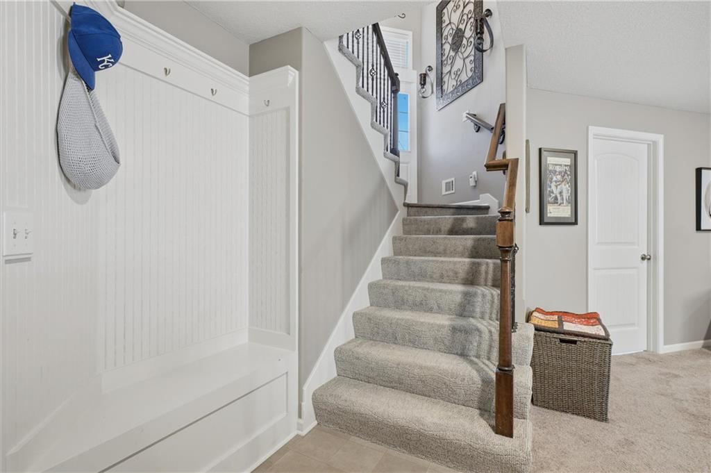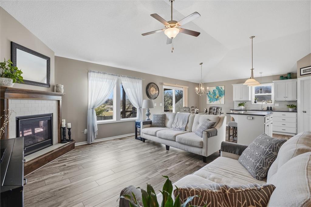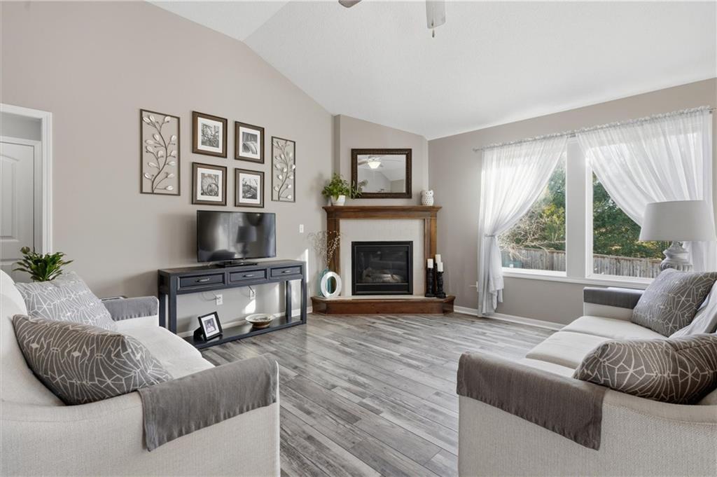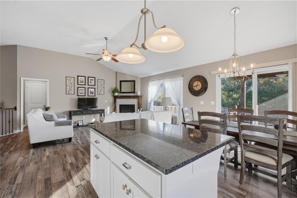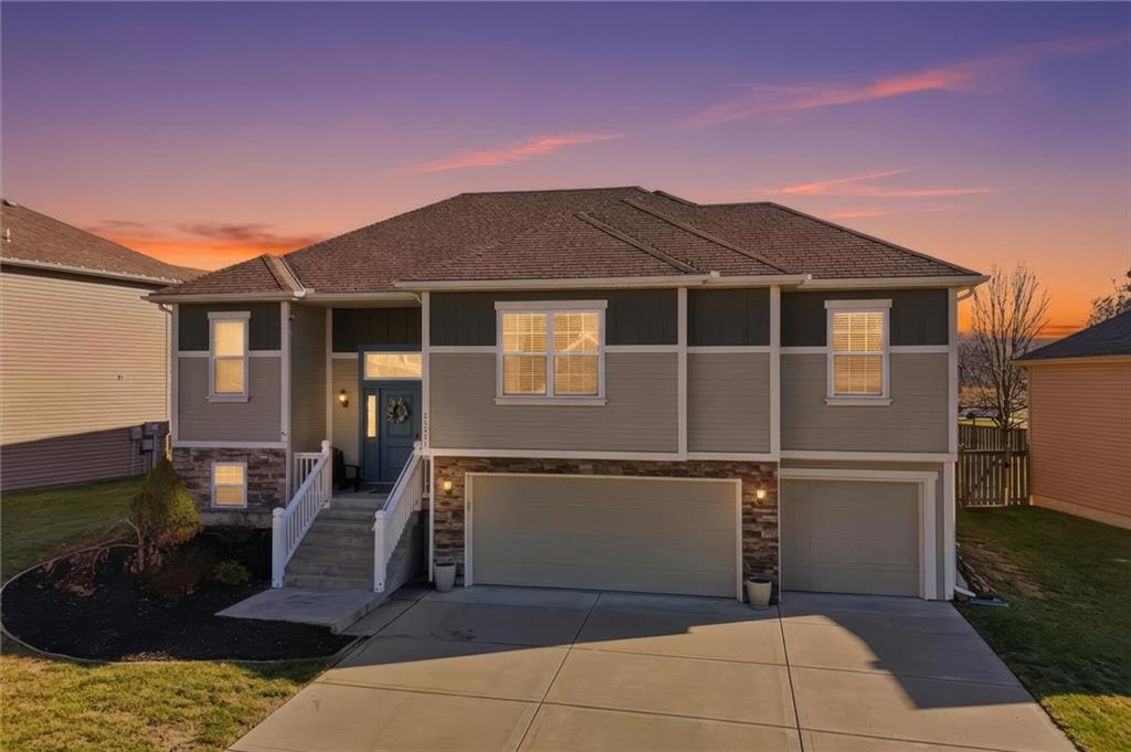 Wide stair entry enhances the curb appeal of this Kansas City address located in the desirable Smithville School District. Step into a spacious entry leading to a light-filled great room with fireplace and an abundance of windows. The open layout flows seamlessly into the kitchen, featuring a granite island with seating, walk-in pantry, tile backsplash, hardwood floors, and an expansive dining area that opens to the deck—perfect for entertaining. The primary suite offers a vaulted ceiling and a luxurious ensuite bath with onyx finishes, double-sink vanity, tile-surround tub, separate shower, and walk-in closet. The finished lower level includes a large family room anchored by a striking dark accent wall with custom slat detailing that defines the entertainment space, plus a bedroom and full bath. A wainscot-accented entry bench off the garage adds both function and style. Outdoor living shines with a freshly stained covered deck, an amazing stamped patio, and a large fenced yard. Enjoy access to the neighborhood pool, adding even more value and convenience for summer fun and community living. FAST AND EASY 435 access