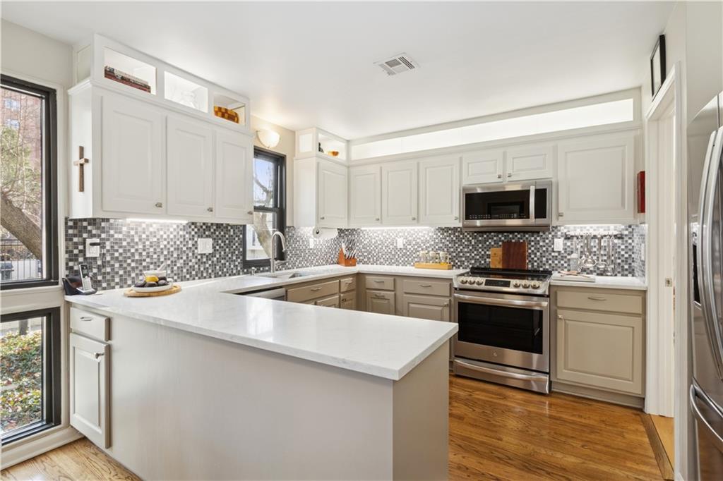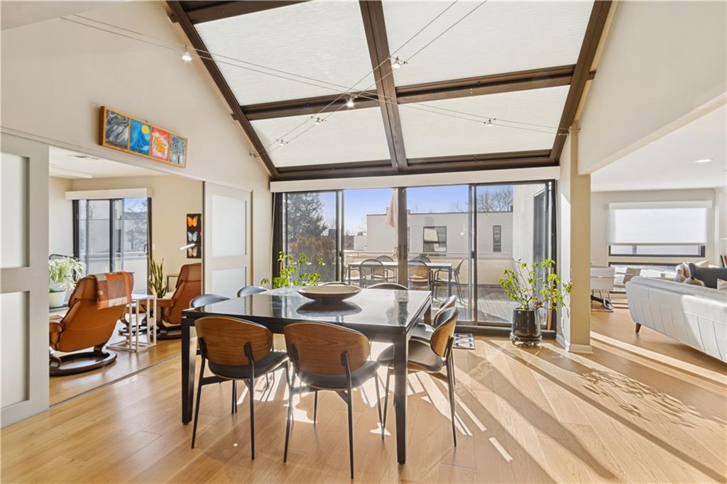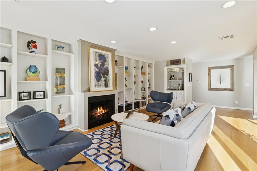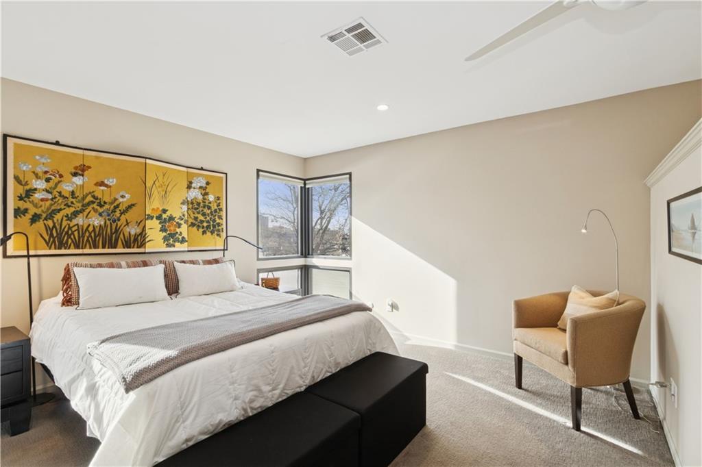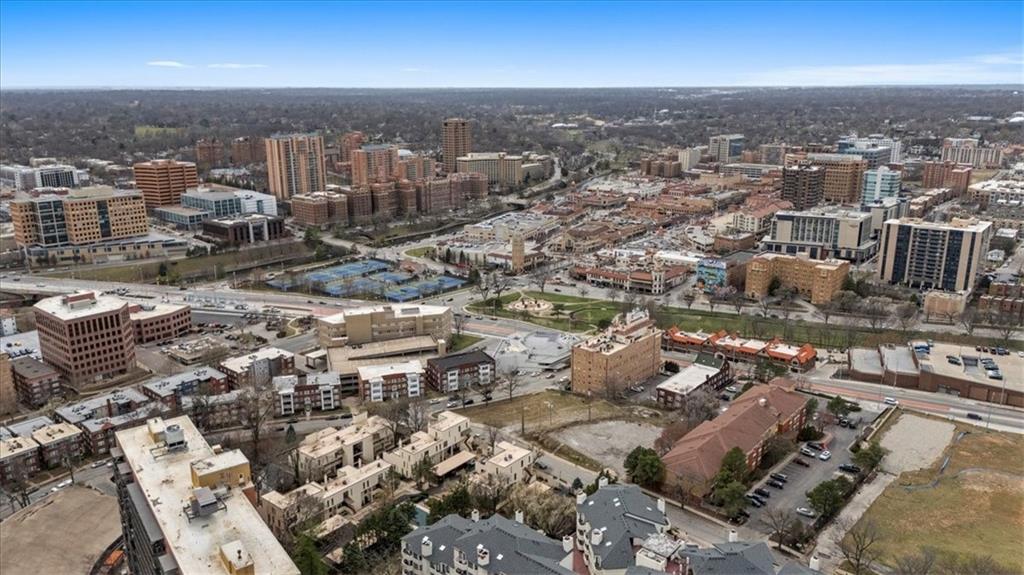 Arguably the best unit in the development as the only one with a straight walk with no stairs from parking to unit & one of only two with its own private entrance! This private, gated community is conveniently nestled between the Country Club Plaza, Kemper Museum, Nelson Atkins Museum and is only a block away from the new Main St streetcar extension! Only 19 units in this contemporary development designed by Moshe Safdie (Crystal Bridges, Kauffman Center) with inground swimming pool and extensive landscaping. This gorgeous unit has a classically contemporary, open floor plan with a ton of thoughtful updates and timeless details throughout. Both the spacious dining room and living room with gas fireplace and wall of bookshelves provide access to the extra large, newly redone Trex deck. You'll love the ample outdoor living/entertaining space that gives you a view of both the pool and the Country Club Plaza! Relax in the primary suite offering both bedroom and office/reading space and loads of closet space! The spa-like primary bathroom has been recently remodeled with a Japanese soaker tub, heated floors, double vanity and walk in shower. The bright secondary bedroom has a walk-in closet, bonus double closet and recently remodeled full bath. And the kitchen- wow! New backsplash and counters, coffee bar, 2 pull out pantries and convenient eat-in space! This spacious unit also gives you a versatile bonus space with sliding doors that open to the dining area and another access point to the deck- use as den, additional office space or 3rd bedroom! So much new in the last 5 years- flooring, all bathrooms, HVAC (1 yr) H2O heater (2yrs) shades, kitchen appliances and more! You'll also find convenient storage space throughout the unit- from the extra space in the utility room to the walk in closet/pantry in the dining room, coat closet in entry, bar closet in living room and linen closet by bathrooms. Extra storage space and 2 covered parking spaces included!