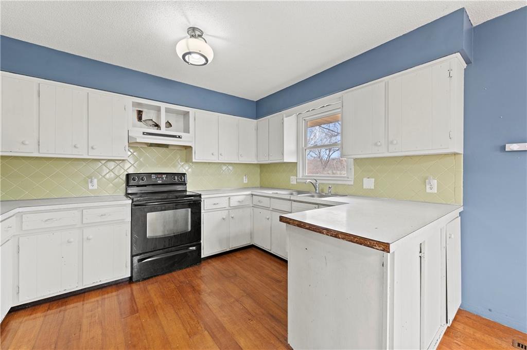 Kitchen featuring white cabinets, light countertops, and black stove