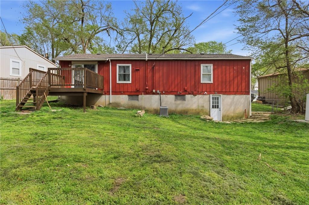 Welcome home to this spacious ranch home located just 10 minutes from the new 2031 season Chiefs stadium! This home combines timeless quality updates with plenty of storage and living space, featuring 3 bedrooms and 1 bath on the upper level and a fourth bedroom, a fifth non-conforming bedroom, and second full bath in the finished walkout basement. The welcoming kitchen features a unique custom epoxy bartop overlooking the dining area. Walk out to the back deck and expansive fenced in backyard, perfect for yard games, firepit cookouts, and all your outdoor activities. You won’t want to miss this gem of a house! Please note that part of the garage has been converted to the dining area living space, so the garage is smaller than the typical garage space. It won't fit most trucks or standard sized SUVs.