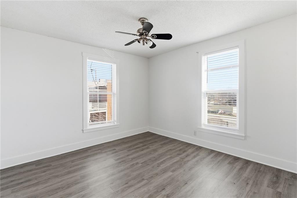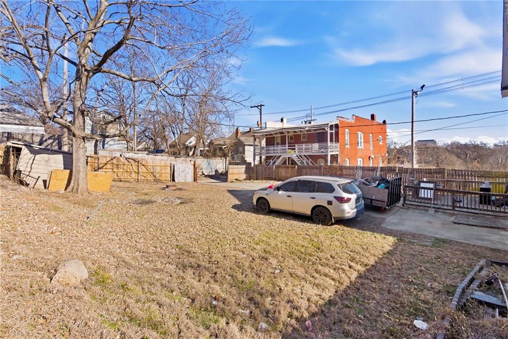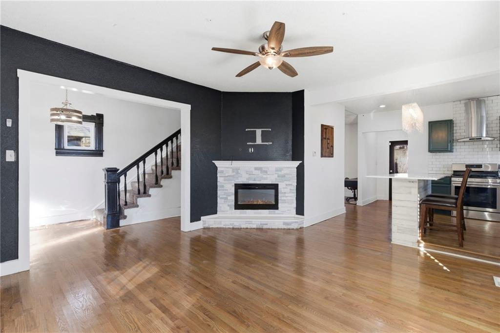 Enjoy your mornings or evenings from the inviting front porch of this charming home. Inside, you’re welcomed by beautiful hardwood floors that flow into the living room, where a stone fireplace creates a warm and cozy ambiance. The kitchen features painted cabinets, a tile backsplash, granite countertops, and a functional island. A formal dining room provides ample space for a full-size table, while a convenient laundry room with half bath is located on the main level. Upstairs, the spacious primary bedroom includes built-in shelving for added character and storage. The updated full bathroom offers a tiled shower, tile flooring, a newer vanity, and granite countertops. The attic space presents exciting potential for additional bedrooms or living space if desired. Outside, enjoy easy alley access at the rear and a nearly completed fenced yard. Located in a highly central area close to shopping and dining, this home offers comfort, charm, and opportunity all in one.