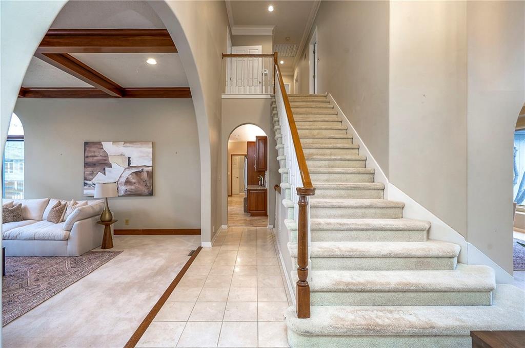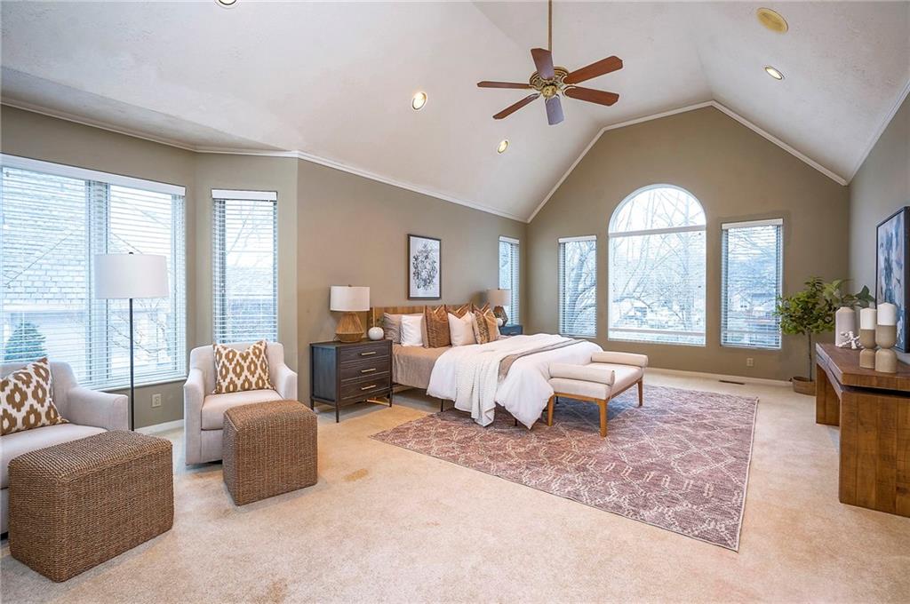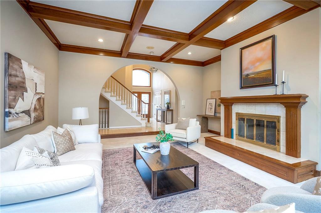 Welcome to this expansive and well-built 1.5-story home offering 4,224 square feet on the main & second floors, plus a large finished walkout basement with 1,500 finished square feet. The home sits on a beautifully landscaped lot in a prime Overland Park location. You’re greeted through a leaded glass front door from a charming courtyard into an impressive two-story entry, where a nearby three-story fireplace anchors the home & immediately showcases its grand scale. The main level features a spacious living room with wood beams, a fireplace & abundant natural light. A large formal dining room easily accommodates entertaining on a grand scale. The kitchen boasts several high-end Wolf appliances & a four-burner gas stove with a griddle. Just off the kitchen is an exceptionally large laundry room. The main-floor primary suite features a vaulted ceiling, generous closet space, and an en-suite bath with separate tub and shower and extensive storage. The second floor offers three very large bedrooms, excellent closets, and two and one-half bathrooms. The half bathroom could potentially become a second laundry room. There is also a bonus room featuring a wet bar, a fireplace and a large vaulted ceiling. It has the potential to serve as a second primary suite. The finished walkout basement is designed for entertaining, with a large bar, multiple gathering areas, wine storage, an additional bedroom and full bath, and access to a spacious patio. There is also significant unfinished space. Additional highlights include a huge deck overlooking the private lot, mature landscaping, a deep side-entry garage well-suited for large SUVs, trucks, and storage, zoned HVAC, partial HVAC replacement, and a major investment in several newer windows. This home offers a rare opportunity—exceptional bones, generous proportions, and a premier location with excellent schools, quick highway access, and nearby shopping and dining—ready for the next owner to bring their design vision to life.