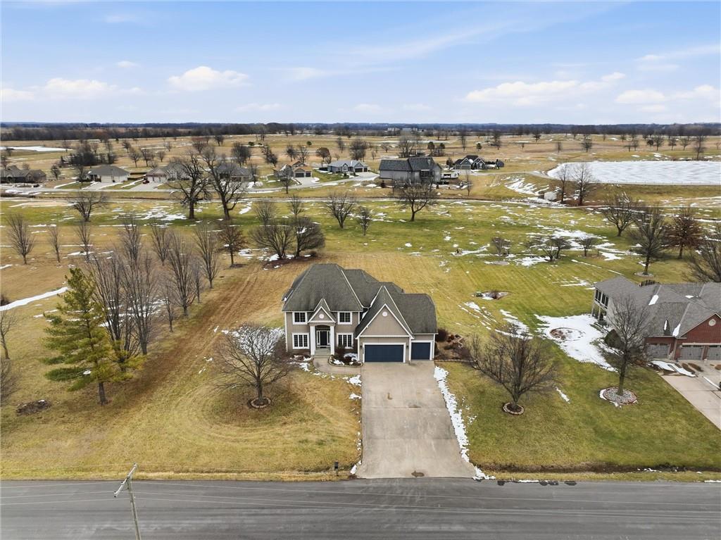 Experience refined living in this two-story home perfectly positioned at Country Creek Estates overlooking the 4th fairway of The Rock and facing the 4th fairway of Hoots Hollow. With 4 spacious bedrooms, 4 full baths, and 1 half bath, this residence offers an exceptional blend of luxury, comfort, and functionality. The main level welcomes you with a grand entryway leading to a formal dining room and an inviting living area featuring a see-through fireplace shared with the cozy hearth room. The kitchen offers updated finishes, abundant cabinetry, and a seamless flow into the hearth room—ideal for entertaining. A dedicated office provides a quiet workspace, while a versatile flex room downstairs offers endless possibilities for a playroom, gym, or hobby space. The primary suite is a private retreat with its own fireplace, ensuite bath, and generous walk-in closet. Bedroom 2 has a private bath while bedroom 3 and 4 share a Jack-n-Jill bath. The walkout basement is designed for entertaining, complete with a wet bar, open recreation area, full bathroom and direct access to the backyard overlooking the fairway. A three-car garage provides ample space for vehicles and storage. Located in the Pleasant Hill school district and minutes to Pleasant Hill, Harrisonville, Lee's Summit and Raymore for shopping and dining while maintaing a country feel.