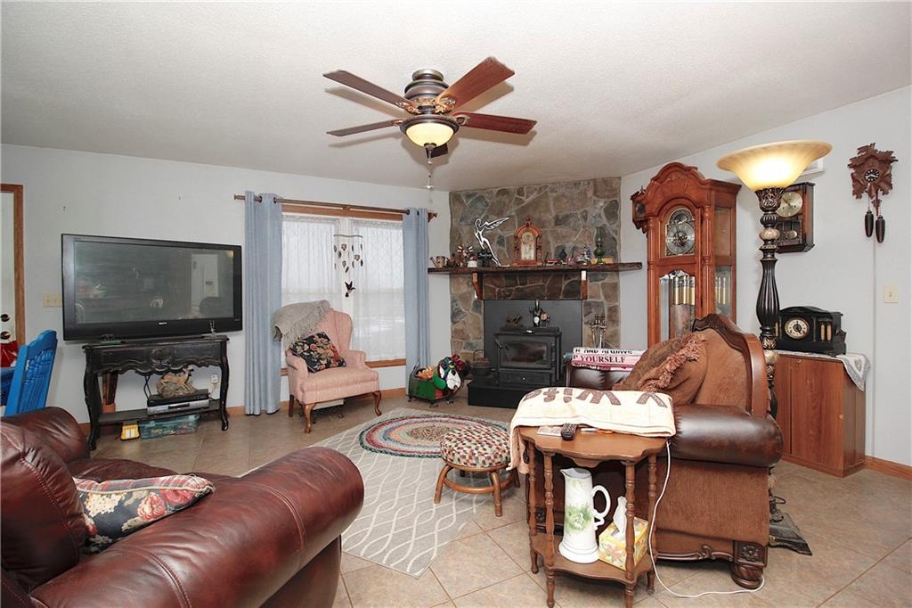 Well cared for, custom Amish built home! Watch wildlife, sunrises & sunsets from your sunroom which overlooks the valley. 2 deer plots so you'll find plenty of deer plus turkey and even quail. Custom kitchen includes cabinets which have rollouts, granite counters, a pantry and an island with wine storage. Solid wood doors throughout. Hardwood floors. Oak bookshelves in office/bedroom. 2 closets in primary bedroom including a walk-in closet. Primary bath has 2 sinks and a huge shower. Walkout basement is ready to be finished however you wish. There is 1 bathroom with a sliding barn door already in the basement plus there are washer/dryer hookups in the basement and also on the main floor in the sunroom. Large stocked pond ready for you to fish in. Fruit trees galore include peach, apple, pear, apricot, plum, sand cherries, chokecherries plus elderberry, black walnut trees, pecan trees and grapevines too! Plenty of beautiful flowers also including irises, day lilies, naked ladies and rose of sharon. Fenced garden area. 30' X 40' 2-car garage/shop has a concrete floor and electric. 28' X 20' outbuilding has a concrete floor, has electric and has a loft. Land consists of hay ground and timber. Located on a blacktop road.