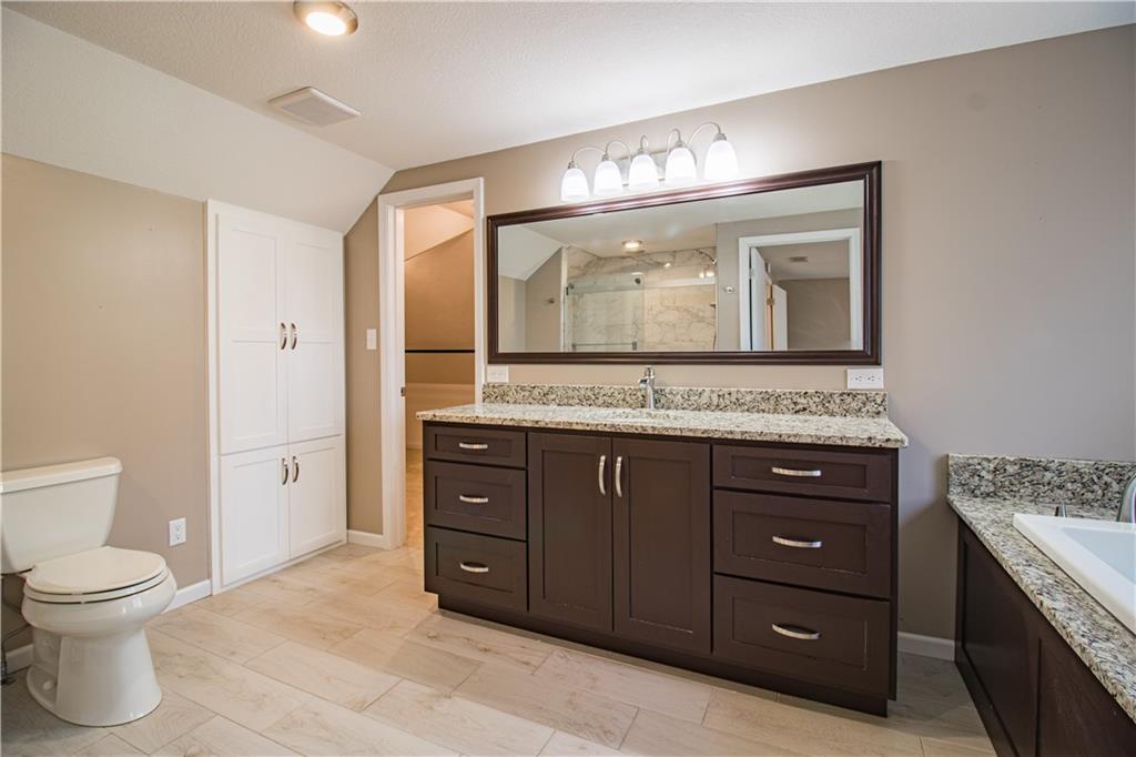 Enjoy the private and scenic feel while having centrally located convenience! This beautiful brick front home is nestled on a large treed lot that offers charm with modern updates. You will enjoy cozy nights around the brick fireplace located in the spacious living room on the main level. The semi-open floor plan is perfect for hosting and entertaining in the substantially sized kitchen and dining area. The kitchen includes beautiful wood cabinets, granite countertops, a kitchen island, stainless steel appliances including a double oven, and more cabinet space than you could need. The sizeable primary bedroom features a bump-out with a large window for plenty of natural light. The primary bedroom is equipped with an ensuite bathroom with ample space, a generously sized vanity, large stand up glass shower with beautiful tile, whirlpool bathtub and spacious walk-in closet. The finished basement offers a family room with another brick fireplace, a bedroom, full bathroom, unfinished storage space, and garage access. The fenced-in backyard provides a picturesque scenery and is perfect for pets.