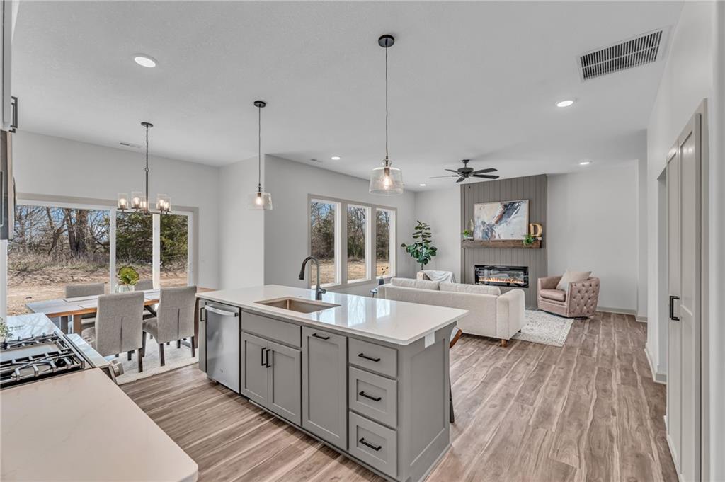 Address is NOT mapped, see directions!!! The Bridgeport floorplan built by Drippé Homes. Open concept daylight basement with tons of natural light! Kitchen furnished with stainless appliances, gas range, microwave, quartz countertops, large island with oversized sink and spacious walk in pantry. Primary opposite other bedrooms. Ensuite features double vanity, tiled walk-in shower, private water closet, MASSIVE closet with window bench and pass through to laundry. Mudroom off garage with boot bench. Cozy up to the fireplace in the living room or enjoy the sunrise from the covered back patio. Home backs to tree-line providing ultimate privacy. Three car garage provides plenty of storage. Directions: From US-56 E and E High Street, Left/North on E High Street, E High Street turns into Rockers Drive, home is on the right on the N side of US-56 E