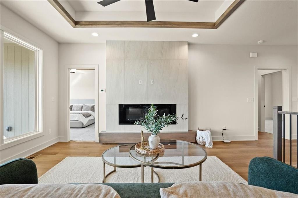Experience the perfect blend of modern sophistication and functional design with the Greystone model by Elevate Design + Build, nestled in the exclusive Prairie View of the Good Ranch. This stunning 4-bedroom, 3-bathroom reverse 1.5-story home is situated on a corner lot, offering the rare combination of a quaint, tranquil atmosphere and close proximity to Raymore’s premium shopping, dining, and highway access. The heart of the home features a sun-drenched, open-concept living area anchored by a striking floor-to-ceiling fireplace and a gourmet-inspired kitchen. Culinary enthusiasts will love the sleek finishes, expansive walk-in pantry, and seamless flow to the covered rear deck—perfect for sunset views over the rolling meadows. The main level thoughtfully hosts both the luxurious primary suite and a secondary bedroom, while the finished lower level provides a generous recreation room, two additional bedrooms, and ample storage. Residents of Prairie View enjoy the rich heritage of the Good Ranch, complete with scenic woodlands, and the peace of mind that comes with living in the highly-rated Raymore-Peculiar School District.