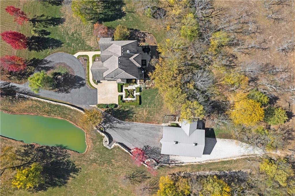Welcome to this 10 acre estate in prime Overland Park location! Nestled at the end of a long private drive lined with vibrant October Glories, this timeless 4 bedroom, 4.5-bath home has been meticulously maintained and offers the perfect blend of luxury, charm, and privacy all just minutes from 69 highway. Set on 10 breathtaking acres backing up to 31 acres of wooded conservation land, this estate offers serene views, a pond, and endless possibilities for recreation or future development. The heart of the home is the open and bright main level featuring formal dining, formal living room, office, hearth room with see-through fireplace and a beautiful updated kitchen featuring top-of-the-line appliances, double ovens, induction cooktop, oversized island, and a spacious walk-in pantry. Upstairs, newly installed wood floors flow throughout the hallway and into the primary suite offering an expansive sitting area with fireplace, large primary bath and oversized walk in closet. Three additional bedrooms are upstairs, each with their own dedicated bathroom and walk in closet. The finished walk out lower level includes a second kitchen area, media room, home office, and additional living space. Outside, you'll find a beautifully maintained drive through barn that houses a fully updated kitchen complete with granite countertops, custom cabinetry, and a walk-in cooler room ideal for hobbies or catering needs. Store outdoor equipment, machinery, and cars in this expansive barn with separate shop and stairs leading to an upper level for additional storage space. Along with a list of updates, the exterior was freshly painted along with a new hot water heater installed last year. Just minutes from 69 Highway, and within the Blue Valley School District this rare home offers easy access to top-tier shopping, dining, and everyday conveniences. Whether you’re seeking a private family estate or land with development potential, this property offers it all! Open House 3/14, 1:00-3:00pm
