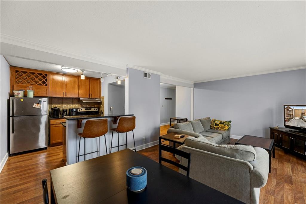 Welcome to Plaza Hills—where location and lifestyle meet in the heart of Kansas City. This light-filled condo offers two spacious bedrooms, two full bathrooms, and one of the largest floor plans in the community. Located in a secure, gated complex just one block from the Country Club Plaza, this upper-level unit features an open-concept layout ideal for everyday living and entertaining. The updated kitchen showcases ceiling-height cabinetry for exceptional storage including a wine rack, granite countertops, stainless steel appliances, and a classic subway tile backsplash. Luxury vinyl plank and hardwood flooring, fresh interior paint, and updated fixtures create a bright, modern feel throughout. All appliances, including the in-unit washer and dryer, stay with the home. French doors open to a private covered deck overlooking the pool—perfect for morning coffee or relaxing evenings. A reserved parking space directly behind the building adds everyday convenience. Residents enjoy premium amenities including a fitness center, secured package delivery, and a beautiful community pool. Ideally positioned between the Country Club Plaza and Westport, and minutes from the Nelson-Atkins Museum of Art, this condo offers unbeatable access to Kansas City’s best dining, shopping, and entertainment.