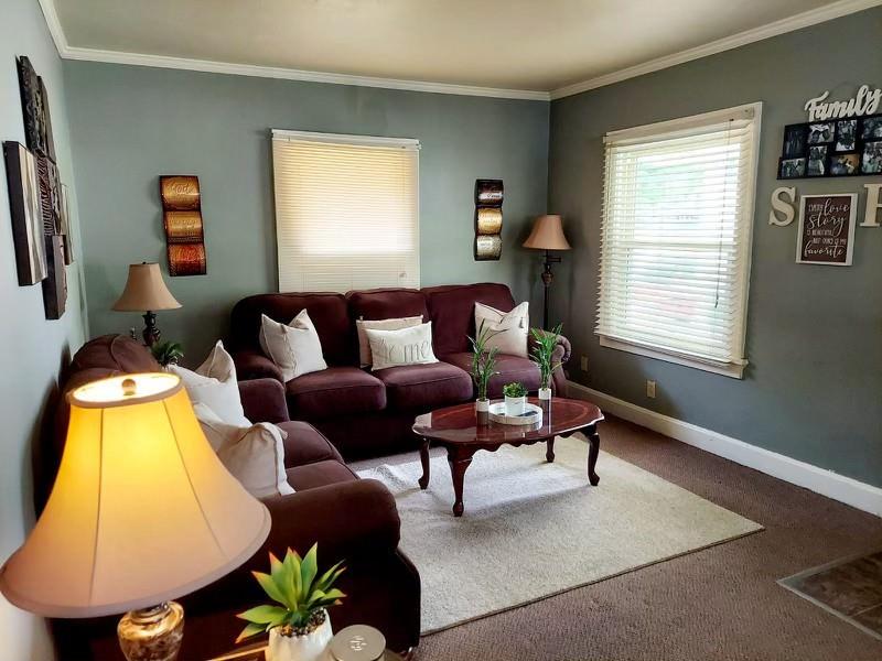 Carpeted living area with crown molding