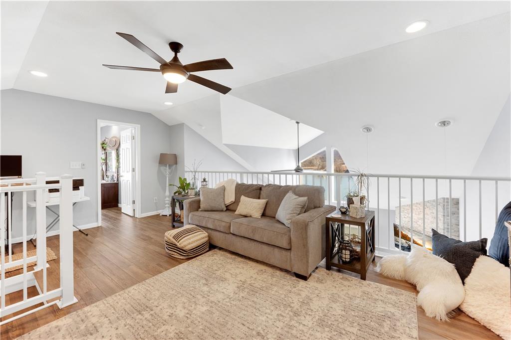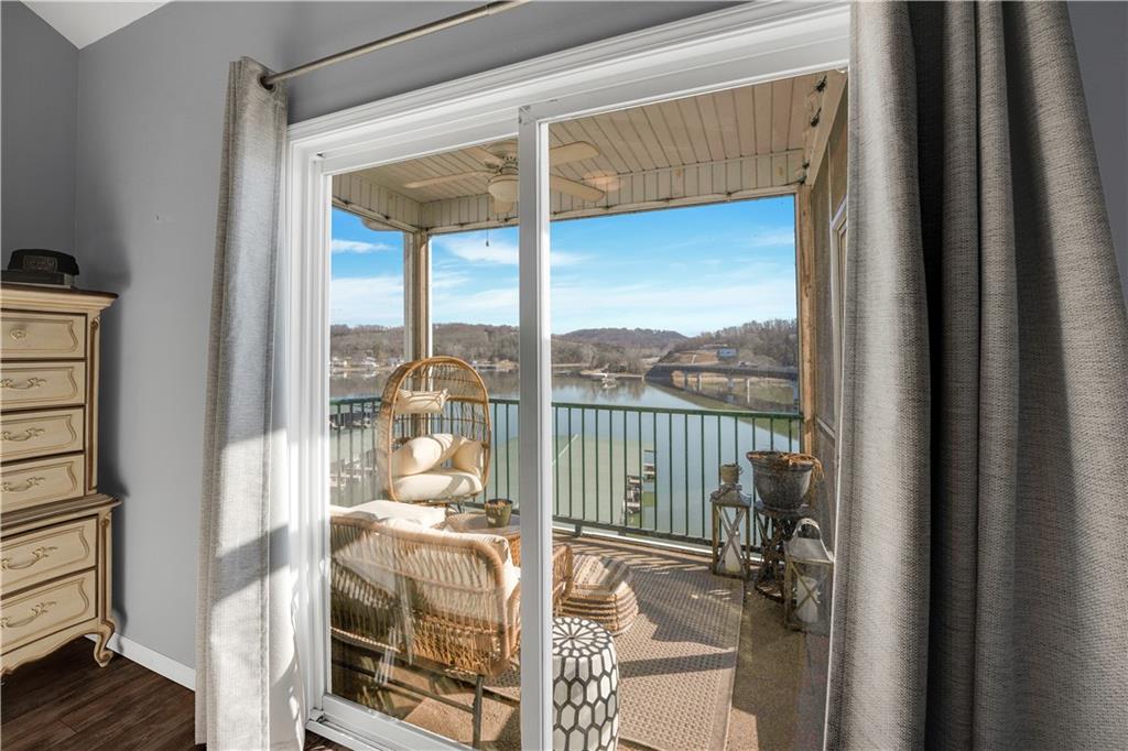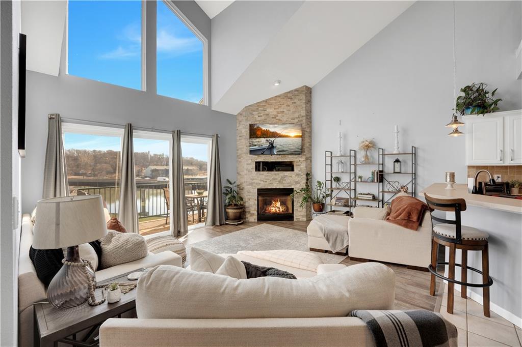 Experience lake living in this 4-bedroom, 2-bath penthouse condominium offering approximately 1,923 square feet in the Cedar Heights community. The open layout features vaulted ceilings, abundant natural light, and a stone fireplace. Enjoy two outdoor spaces, including a screened deck and an open sun deck for relaxing and taking in the surroundings. The kitchen offers stainless steel appliances, a spacious peninsula, and tile backsplash. The primary suite includes vaulted ceilings, a walk-in shower, and walk-in closet. A second bedroom connects to a Jack-and-Jill bath, with an additional main-level bedroom. The upper-level loft provides a flexible living area plus a fourth bedroom with walk-in closet and plumbing for a potential third bath. A 12x30 boat slip is included. Community amenities include three swimming pools and maintained common areas. Convenient access to golf, dining, shopping, entertainment, and Ballparks National. Seller will pay all levied special assessments prior to closing. Nightly rentals permitted per community guidelines. This property is offered furnished for a turn key experience. Some antiques and personal items are not included. Don't miss this opportunity for a great lake condo!