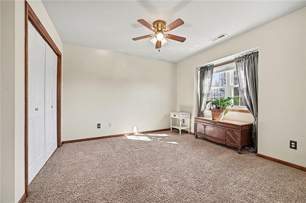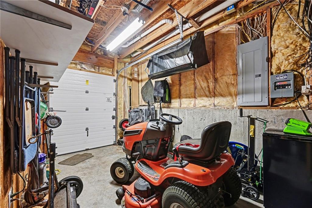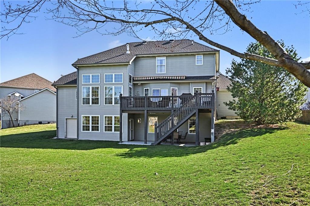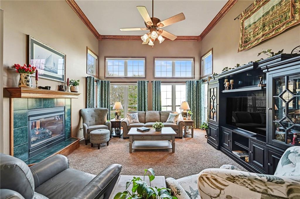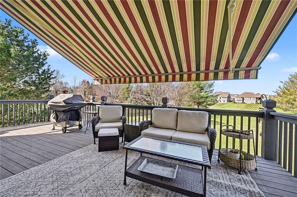 Stunning 1.5-story home in the highly desirable Lakes of Oakmont, ideally situated on a quiet cul-de-sac and featuring a welcoming covered front porch, spacious 3-car garage, plus an additional rear garden garage. This beautifully maintained home offers exceptional quality and thoughtful upgrades throughout. The main level features a spacious living room, formal dining room, and a well-appointed kitchen with solid surface countertops, pantry pull-outs, built-in buffet, and a beautiful see-through fireplace shared between the eat-in kitchen and living room. Also on the main level are the primary suite, laundry room, and convenient half bath for true main-level living. The primary bathroom offers heated floors, creating a spa-like retreat you’ll appreciate every day. Upstairs includes three generously sized bedrooms, two full bathrooms with direct access from each bedroom, providing comfort and privacy for family or guests. The finished walkout lower level is ideal for entertaining with a large family room, custom built-ins, wet bar area, and a dedicated office that could easily serve as a fifth bedroom, along with a full bath, spacious storage room, and convenient access to the rear garden garage—perfect for lawn equipment, a small vehicle, hobbies, or workshop space, and even includes an additional oven. Outdoor living is just as impressive with a covered patio, full-yard sprinkler system, routine pest control services, and an electric awning over the back deck for shaded relaxation. Major updates include a one-year-old roof and a new garage door opener featuring battery backup.