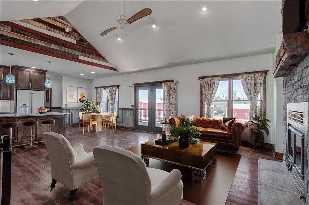 Gorgeous dream home located on 20 +/- picturesque acres. Expect to be impressed upon entering this 4 bedroom, 4 bath ranch. Open floor plan, reclaimed hardwood floors throughout main living area, vaulted ceilings, an abundance of natural light, solid wood doors and upgraded lighting. Great room featuring floor to ceiling stone fireplace, open to stunning kitchen boasting GE Cafe appliances, custom cabinetry with marble pulls and knobs, granite countertops, pot filler, gas stove and walk-in pantry. Large island and dining space to accommodate all of your family and friends making it perfect for hosting gatherings. Step outside to your private deck for enjoying the fabulous sunsets. Great master suite with vaulted ceiling, double vanity, separate shower, relaxing soaking tub and huge walk-in closet. Two additional spacious bedrooms on main level as well. Full finished walk-out lower level complete with wet bar, huge family/rec room, plenty of windows, 4th bedroom, full bathroom, safe room, plus unfinished space for storage. The property also features a 30x50 insulated shop with 200 AMP power, concrete floor, large wood burning stove, 2 separate garage doors (in/out) plus three 16x20 bays with lighting. Newly added 30x34 2 stall stable with commodity area and 30x10 lean to for additional equipment storage or animal cover. The cutest custom chicken house stays too. This remarkable property is not only beautiful, but it virtually has it all! Perfect farm space for cattle or horses, abundance of wildlife, trails through the timber down by the creek and fish in the pond. It is a sanctuary retreat by day and night all year long! Serene environment to call home! All located on hard-surface road. Easy commute to Lawrence, 15 minute commute to Baldwin City and Topeka!