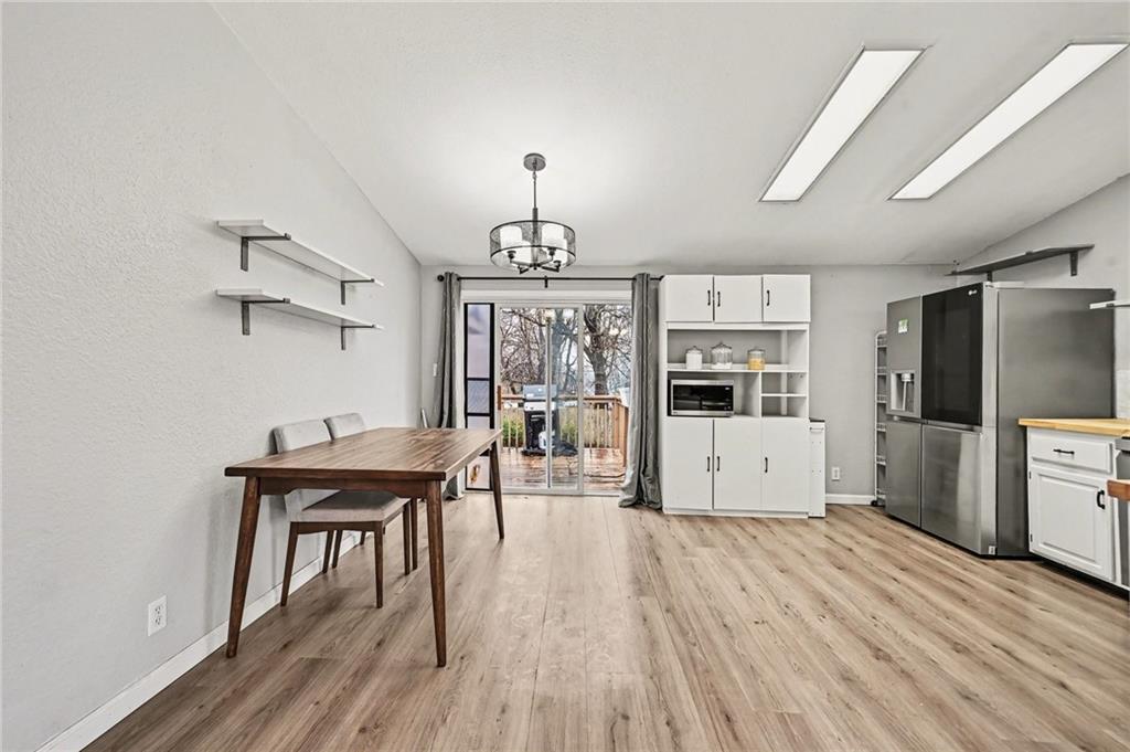 Welcome to 405 Wherritt Lane in Liberty, Missouri, a charming ranch style home tucked away on a quiet cul-de-sac in a friendly neighborhood with no HOA. With three bedrooms, two baths, and 1,260 square feet, this thoughtfully updated home is designed for comfortable, easy one-level living. Inside, the bright, open layout is enhanced by vaulted ceilings, new flooring, and abundant natural light. The updated eat-in kitchen features new appliances and charming farm-style touches. Just off the kitchen, a deck creates the perfect spot for outdoor dining or entertaining while overlooking the large backyard surrounded with beautiful, mature trees. The spacious living area flows easily through the home, where extra-wide door frames and hallways create a wheelchair-friendly layout that feels open and accessible. The main bathroom has been beautifully renovated with custom built-ins, pull-out storage, and a spa-like roll-in shower designed for both comfort and convenience. Outside, the oversized yard and flat driveway add to the home’s easy livability and provide plenty of room to relax, garden, or gather with friends and family. Located within the Glenaire city limits, residents benefit from Liberty Public Schools while paying only county taxes. The location also puts you just minutes from the shops, restaurants, and local charm of Historic Downtown Liberty, the scenic campus of William Jewell College, and outdoor recreation at Stocksdale Park, with convenient highway access for commuting throughout the Kansas City metro. Move-in ready and full of thoughtful updates, this Liberty ranch blends charm, functionality, and a location that makes everyday life feel easy. Be sure to check out the attached list of recent updates and improvements.