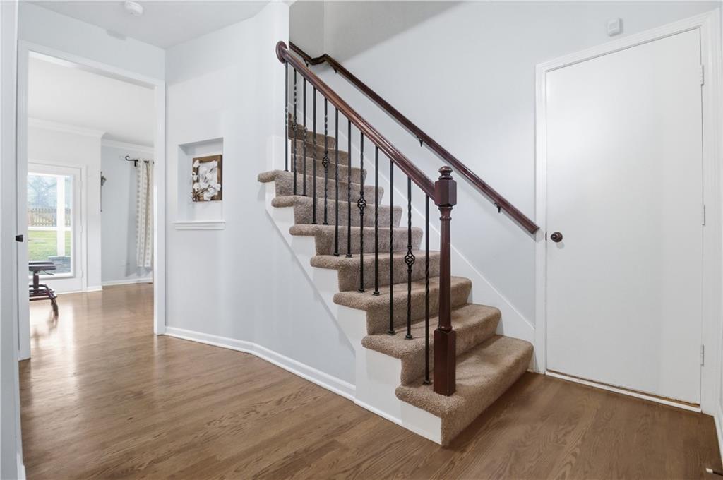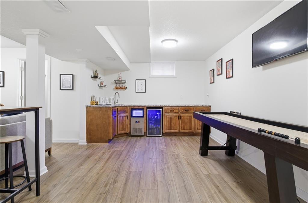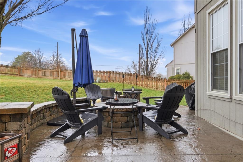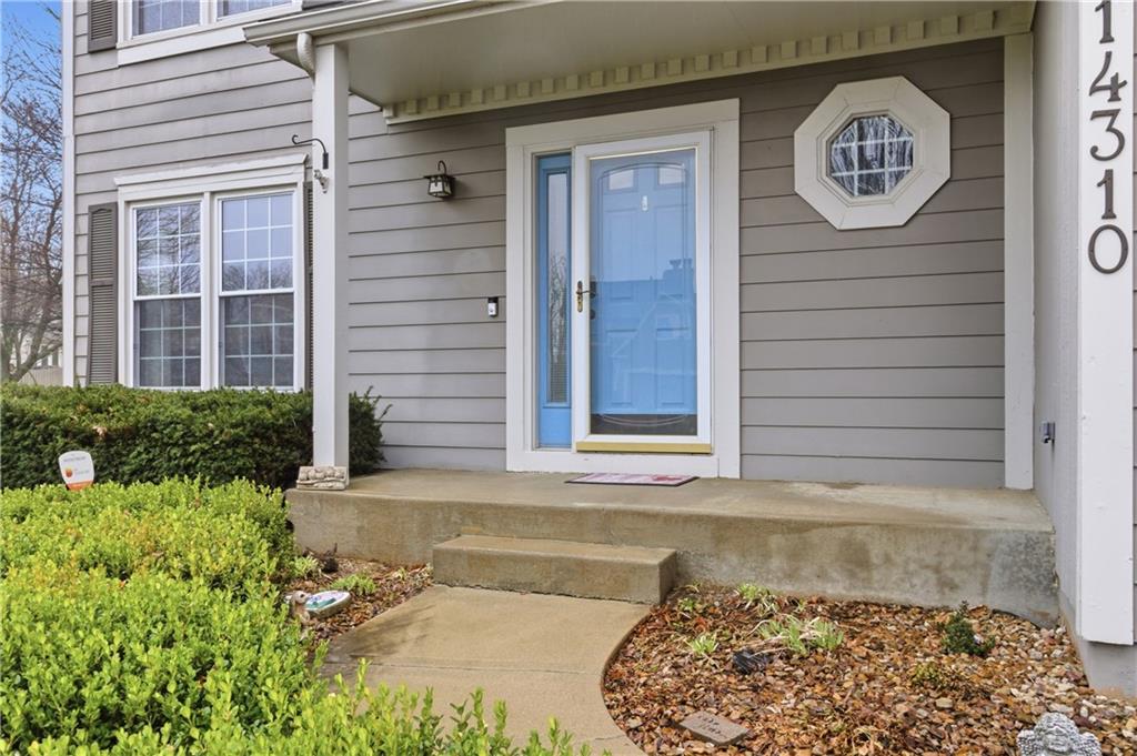 Updated 2-sty home on cul-de-sac lot in highly desirable Blue Valley School District! The remodeled kitchen showcases painted cabinetry, new island with granite and beverage fridge plus gas range. Hardwood floors run throughout main floor. Great room boasts fireplace and floor to ceiling windows for great natural light. Fresh paint throughout the main floor in 2024 makes this home move in ready. The finished lower level (2024) offers luxury vinyl flooring, stylish wet bar with ice maker and beverage fridge. Additional full bath in lower level. Upstairs features three spacious secondary bedrooms and a private primary suite with double sink, tub and HUGE walk in closet. Furnace replaced in Dec 2024. Enjoy fenced backyard with paver patio, fire pit, and gas line ready for grilling. Home backs to greenspace/utility easement to enhance privacy. Driveway expanded to create additional parking space. This home is a MUST SEE!
