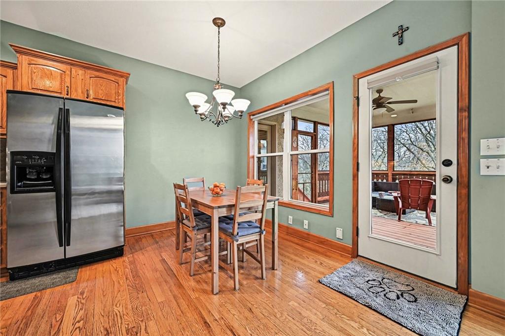 Located just minutes from Smithville Lake, walking trails, historic downtown, and the high school, this home offers both comfort and convenience. Do not miss this incredible opportunity. Upon entering this charming home, you are welcomed by beautiful wooden floors, vaulted ceilings, and an abundance of natural light from the large windows throughout the main floor. The dining room is filled with sunshine and features classic wainscoting along the walls. The living room offers a cozy gas fireplace and soaring ceilings, creating the perfect space for family gatherings or quiet nights in. The kitchen continues the classic wood style and is equipped with stainless steel appliances, a walk in pantry, and a breakfast nook with access to the screened in porch. The primary bedroom feels like its own private retreat with a spacious layout, plenty of windows, and a charming fireplace. The ensuite bathroom is truly a dream, featuring a jetted tub with a fireplace above, a large walk in shower, dual sinks with a makeup station between them, and a generous walk in closet. The remainder of the main floor includes two additional bedrooms, a full bathroom, and a conveniently located laundry room. Upstairs, you will find a large bedroom with recently updated flooring and a full bathroom. The walk out basement is designed for entertaining with a spacious recreation area, large windows, and a beautifully crafted wet bar. There is room for a pool table, craft space, and a gathering area, along with a dedicated exercise room, an additional bedroom, and a full bathroom. The basement walks out to a spacious backyard that backs to a small wooded area for added privacy.