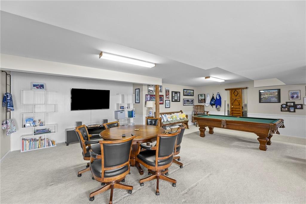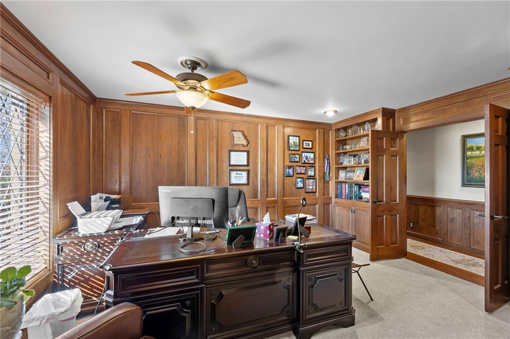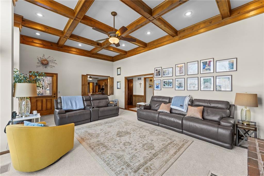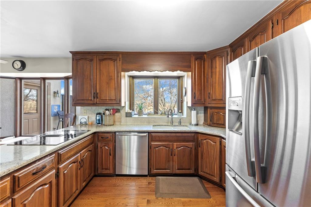 Nestled on 4.95 lush acres just north of the Paola Country Club, this exceptional custom-built 1.5-story residence offers a rare blend of superior craftsmanship and tranquil lakeside living. The heart of the home is a gourmet kitchen finished with rich walnut cabinetry, granite countertops, and warm oak hardwood floors, which flows seamlessly into a magnificent great room where walls of windows frame breathtaking views of a 2-3 acre stocked shared lake. Architectural integrity shines through the 6-inch wall construction, Anderson windows, and a high-impact resistant roof, while the interior showcases refined details like a custom-designed pecan study with solid core doors and two fireplaces. The main-floor primary suite serves as a private sanctuary with vaulted ceilings, walk-in closets, a shower and granite double vanities with Kohler fixtures. Upstairs, three additional spacious bedrooms share a beautifully updated full bathroom, ensuring comfort for family or guests. The versatile walkout lower level extends the living space with a bright family room, den, and a dedicated 24x13 workshop, all leading out to a sprawling yard, perfect for entertaining. Enjoy the fruit trees, blackberry bushes, strawberry and asparagus patches, plus a 30 ft. x 12 ft. garden area. Situated on a quiet dead-end road, this meticulously maintained brick frame and stone trim estate provides a serene escape without sacrificing proximity to local amenities.