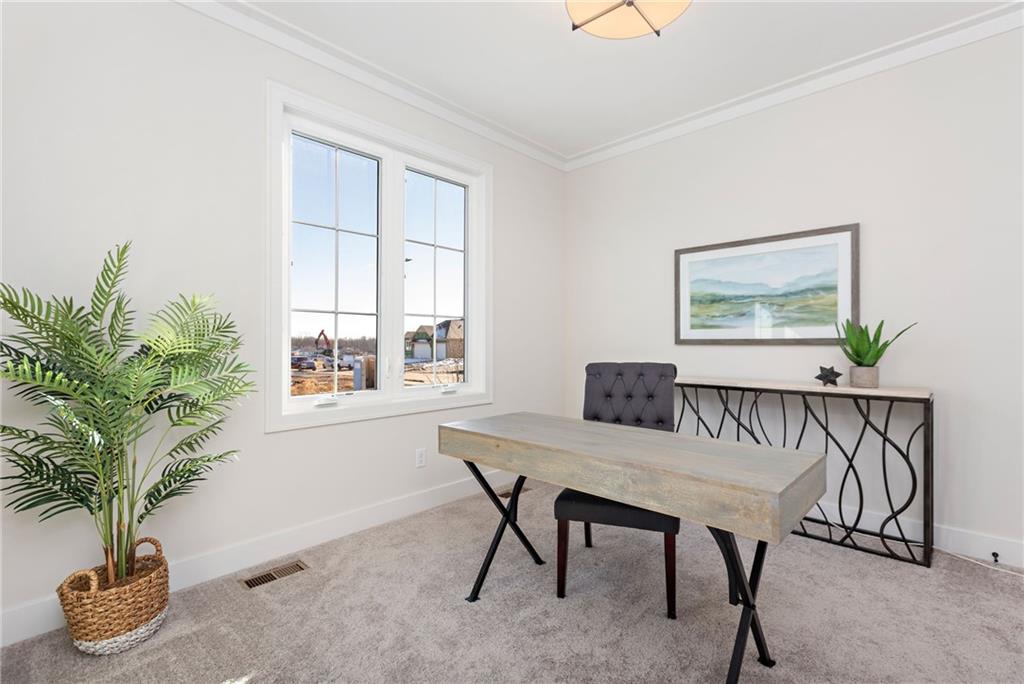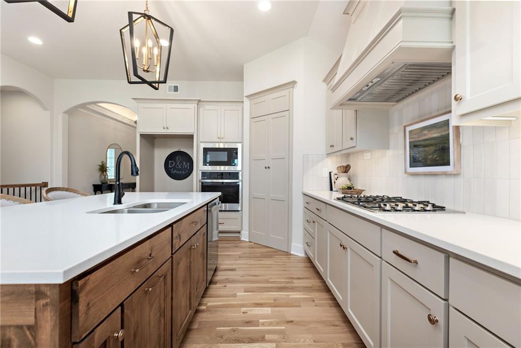 4 Car Garage, backs to Greenspace! Open floor plan built to maximize space. Custom kitchen cabinets, gas cook top, quartz tops, large walk-in pantry and plenty of kitchen storage. Convenient laundry off master, walk in shower (two head) plus tub. His and her closets unlike any reverse plan at this price. No more fighting over closet space. Unique, dry bar off family room, custom beams in family room with stone fireplace. Lower level is a full daylight for natural light. Large rec area has wet bar. Hallway to two more private bedrooms. Wonderful, covered deck, Sprinkler system. Photos are representation of home under construction. Actual home has 4 car front entry. All room sizes are estimate and subject to verification.