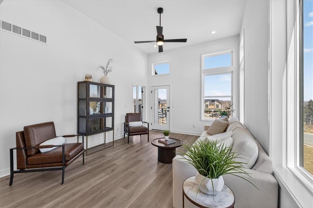 Discover refined, low-maintenance living at The Cliffs of Watercrest, where modern design and everyday convenience come together beautifully. This exclusive 1.5-story townhome blends contemporary style with functional comfort while offering a truly elevated lifestyle. Inside, soaring 20-foot ceilings and an open-concept layout create a bright, airy atmosphere filled with natural light. The spacious living area flows effortlessly into a functional luxury kitchen with premium finishes—perfect for hosting gatherings or enjoying a quiet evening at home. The main-level primary suite serves as a private retreat, featuring a spa-like bath with dual vanities and a generous walk-in closet and ensuite laundry. Upstairs, a versatile loft space leads to your own private rooftop terrace—an ideal setting for morning coffee, sunset views, or entertaining guests. Two additional large secondary suites each with their own walk-in closets ensures comfort and privacy for family or visitors. An unfinished walkout basement provides abundant storage and endless opportunities to customize the space to fit your needs. Ideally situated just minutes from premier shopping, dining, and major highways, The Cliffs of Watercrest offers the perfect balance of accessibility and upscale living. With low-maintenance services included, you can truly embrace a lock-and-leave lifestyle. ***Residents of the Cliffs also receive access to the amenities of WaterCrest Landing including the Pool, future Pickleball Courts and Play Area*** The Cliffs townhomes are also a perfect opportunity for investors looking to build their portfolio and take advantage of an exciting opportunity in a rapidly BOOMING area of Johnson County. Schedule your showing today!