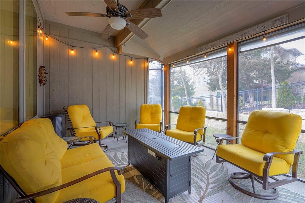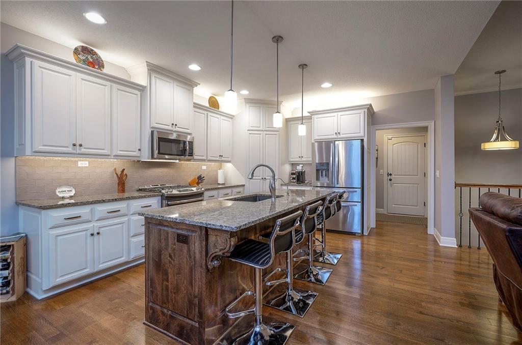 Nestled in a quiet cul-de-sac, this EXTREMELY WELL-MAINTAINED 2,800 SF ranch offers the ultimate in MAIN FLOOR LIVING. The open-concept design impresses with 10’ ceilings, wide-plank wood floors, and CROWN MOLDING throughout. A spacious chef’s kitchen serves as the heart of the home, featuring a large island, gas cooktop, deep walk-in pantry, and a generous dining area. The primary suite is a true retreat, boasting a soaker tub, dual vanity, and a walk-in shower with a seat that conveniently connects to the MAIN FLOOR LAUNDRY via the closet. Step outside to your private oasis: a SCREENED PATIO WITH AN EXTENDED ROOF and ceiling fan, overlooking UPGRADED LANDSCAPING with an engineered limestone retaining wall and berm—perfect for those seeking a TIDY YARD WITH LOW MAINTENANCE. The curb appeal is unmatched, featuring FRESH EXTERIOR PAINT (OCT 2025), GUTTER SCREENS, and PERMANENT CHRISTMAS LIGHTING for year-round ease. For the hobbyist, the 3-CAR GARAGE is a standout, fully equipped with a MINI-SPLIT AC/HEAT SYSTEM (SUMMER 2025). Inside, the home feels brand new with FRESH INTERIOR PAINT (2022) and NEWER CARPET THROUGHOUT. The finished basement is an entertainer's dream, showcasing high ceilings, a LARGE CUSTOM BAR (INCLUDES REFRIGERATOR), and an expansive game/media space, along with two additional bedrooms and a full bath. Additional high-value upgrades include a HAGUE WATER SOFTENER SYSTEM WITH A TRANSFERABLE WARRANTY, a 50-gallon water heater, a gas fireplace, and a durable 50-YEAR ROOF. This home combines luxury and practicality in an unbeatable location near K-10, I-35, premier shopping, dining, parks, and top-rated schools.