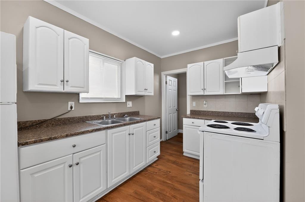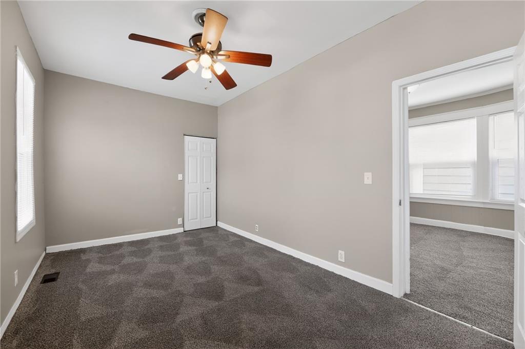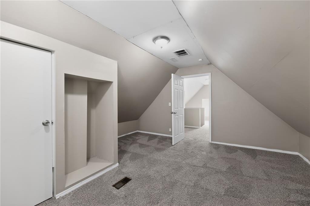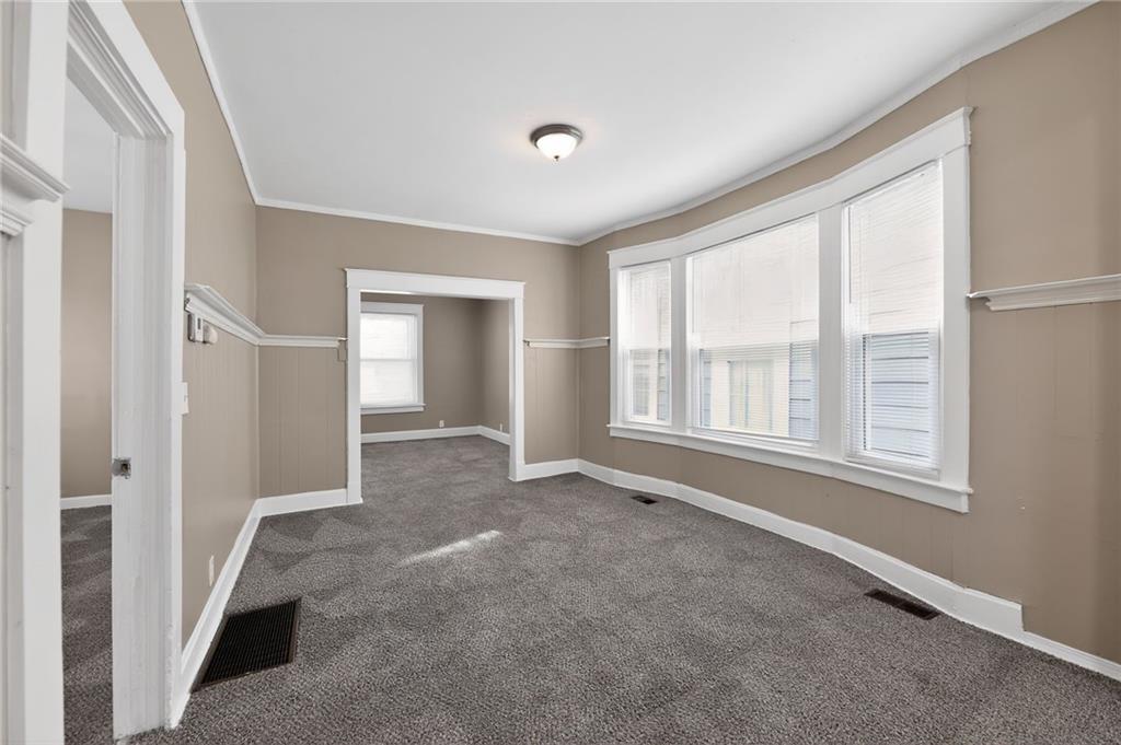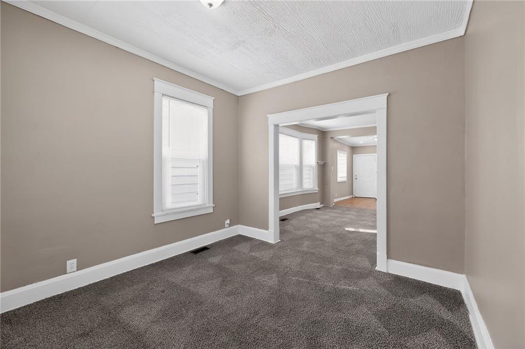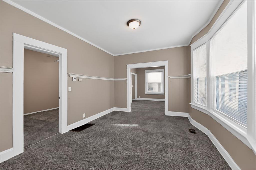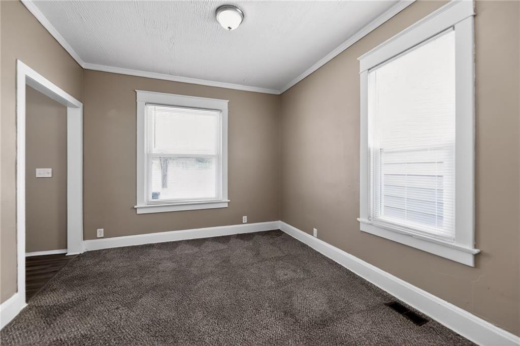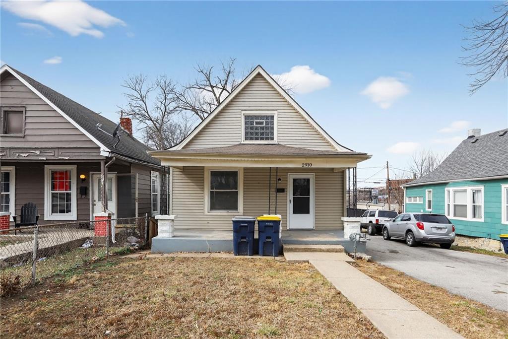 Lovely 1.5-story bungalow featuring a covered front porch and low-maintenance exterior siding, set on a level lot. Inside, the home offers a bright living area with neutral paint, white trim, and large windows that provide abundant natural light. The kitchen includes white cabinetry, laminate countertops, a double-basin sink, and white appliances, with adjacent space for dining. Carpeted bedrooms offer comfortable layouts, and the upper-level rooms feature vaulted ceilings and unique angles. Additional highlights include updated flooring in select areas, ample storage, and a functional floor plan that maximizes space throughout.