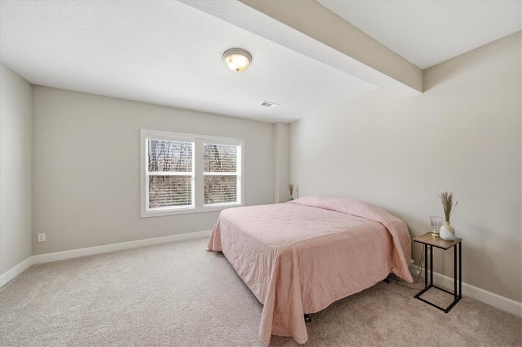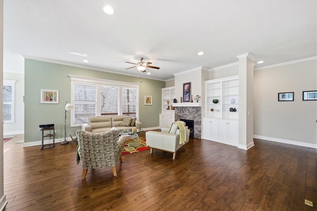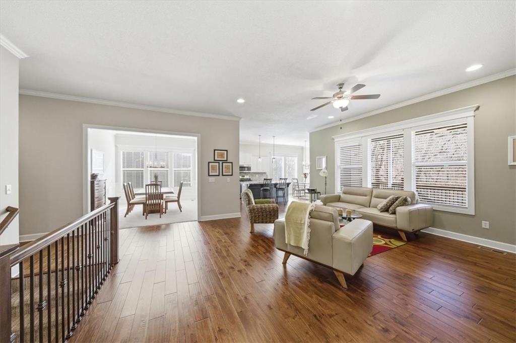 This beautifully maintained 4-bedroom, 3.5-bath ranch-style home is located in The Enclave at Shoal Creek Valley. The thoughtfully designed main level features three bedrooms, a private office with French doors, formal dining room, and a breakfast nook. Interior highlights include custom built-ins, extensive crown molding, and additional recessed lighting throughout the main living areas. The kitchen is equipped with granite countertops, a gas range, and under-cabinet lighting. Engineered hardwood flooring extends through the kitchen, foyer, great room, and primary bedroom. The primary bathroom offers a sliding barn door, custom cabinetry, and a soaking tub. The finished walkout lower level includes an additional bedroom, full bathroom, expansive family room, and wet bar—ideal for entertaining. The home backs to a wooded preserve, offering scenic natural views from the covered, stained deck and lower-level patio. Additional upgrades include high-efficiency blown-in insulation, a LeafFilter gutter guard system, epoxy-coated garage floor, insulated garage doors, and a utility sink in the garage. Age: 8.5 years (Original owners; purchased new on October 1, 2017) Total Finished Living Space: 3,415 sq. ft. Main Level: 2,345 sq. ft. Lower Level: 1,070 sq. ft. HOA Dues: $146/month ($1,750 annually) Gated entry with access to community pool Clubhouse and water park amenities