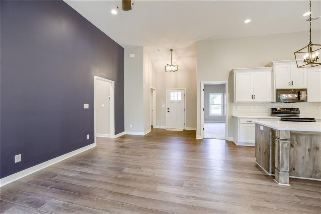 Brand new true ranch offers zero entry. No steps on main level! This open plan features high ceiling, fireplace, large stained kitchen island, custom cabinetry, pantry with barn door, quartz countertops and laundry room. Primary suite with walk-in closet. Double vanity and walk-in shower. Covered porch and patio. Unfinished walkout lower level. Located in a craftsman style neighborhood. AT FOUNDATION STAGE! Buyer can choose colors. House is located in an area that QUALIFIES FOR USDA HOME LOAN**0 MONEY DOWN FINANCING