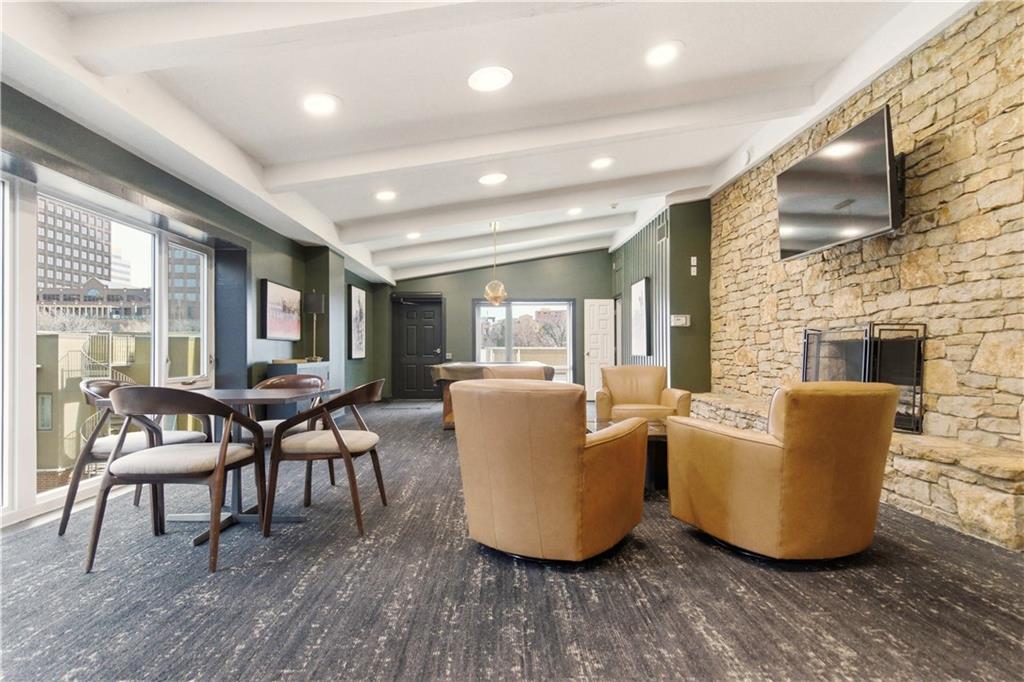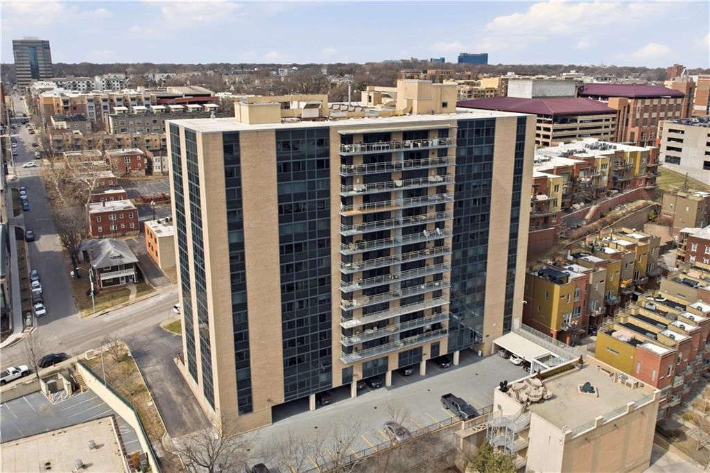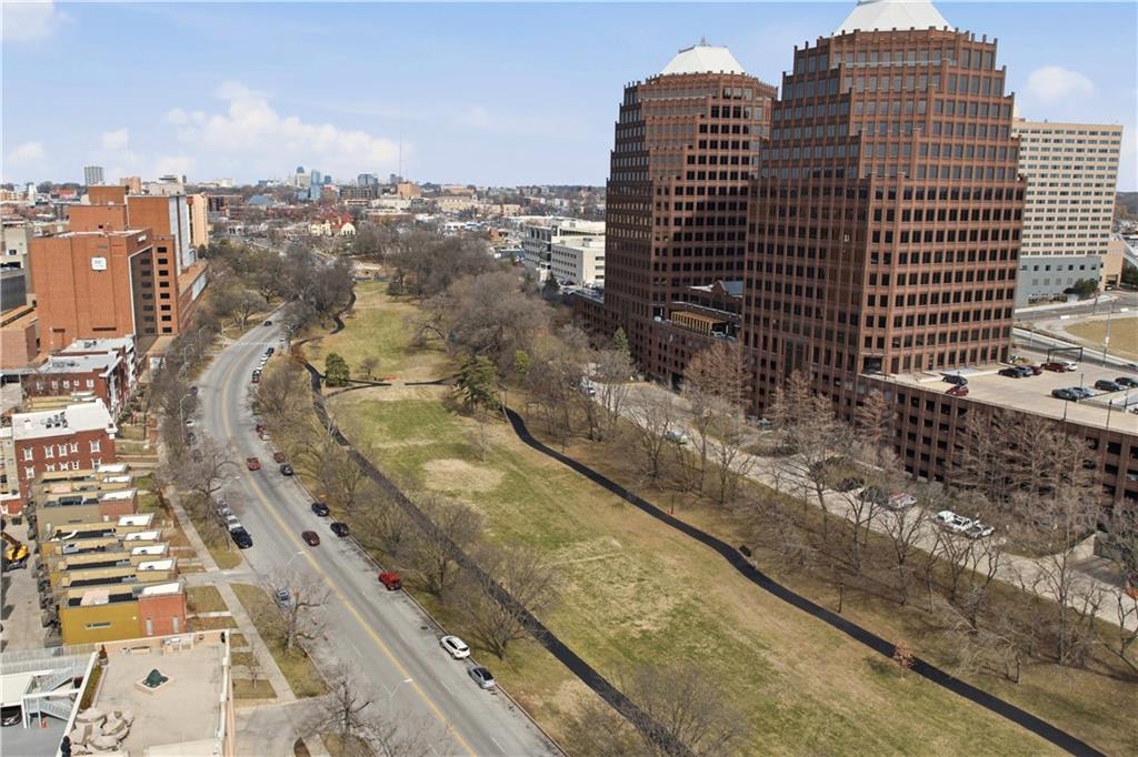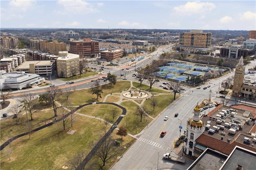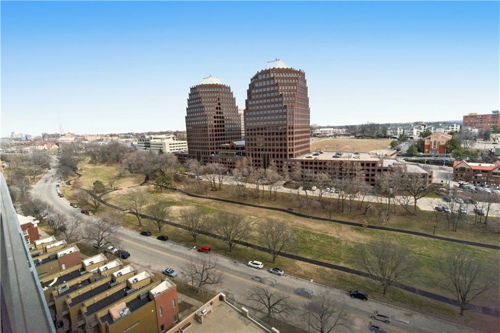 Perched on the 11th floor, this seldom offered unit with a 30' balcony has unparalleled views of Mill Creek Park and the Plaza skyline. Five-minute walk to hop on the streetcar to Downtown KC or Power and Light!! Completely renovated and turnkey, this is your opportunity to enjoy maintenance free living in a fabulous Plaza location and includes a coveted covered garage space for your vehicle. This darling unit won't last with all the upgrades the Owners have put in including Hunter Douglas automatic shades, remodeled kitchen with granite and bar, office with access to balcony, updated bathroom and more! This building has 24 hour front door security and amenities which include exercise room, hobby room, mail room, parking and multiple party spaces. Water, trash, heating and cooling are included in HOA fee. Storage space comes with unit. Unbeatable location with walking distance to everything you might possibly need! Don't wait to check this one out!