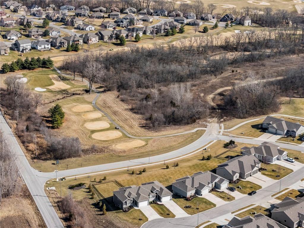 Stunning View of the Golf Course! From Tee Box to the Green par 3 View! Walkout lot on a cul-de-sac! This reverse 1.5 story home has everything you need on the main level. Enter into the great room and instantly see the spectacular view of Hole 17! Kitchen with walk-in pantry and quartz counters. Drop Zone/Boot Bench and 1/2 Bath just off the garage and kitchen. Covered deck is perfect for enjoying a cup of coffee while taking in the sunrise and the scenery! Primary suite includes bedroom with LARGE walk-in closet, bathroom with walk-in shower, laundry right off the closet, and office area. Finished lower level Family Room walks out to great fenced yard! Family Room perfect for an entertainment center. Two bedrooms and a full bath as well. Plenty of storage in the unfinished area. Fresh interior paint 2 years. Stained covered Deck. Maintenance includes comprehensive lawn care, snow removal, exterior painting, and replacement of roof and gutters as needed. Also includes access to neighborhood pool, play area, pickleball & tennis courts. Falcon Lakes golf course is a public course with a bar and grill, "The Nest". Highly rated Basehor-Linwood School District! Conveniently located just off K-7 for easy access to all parts of the metro area. Just 10 minutes to the Legends Shopping and Entertainment District and 30 minutes to the airport.