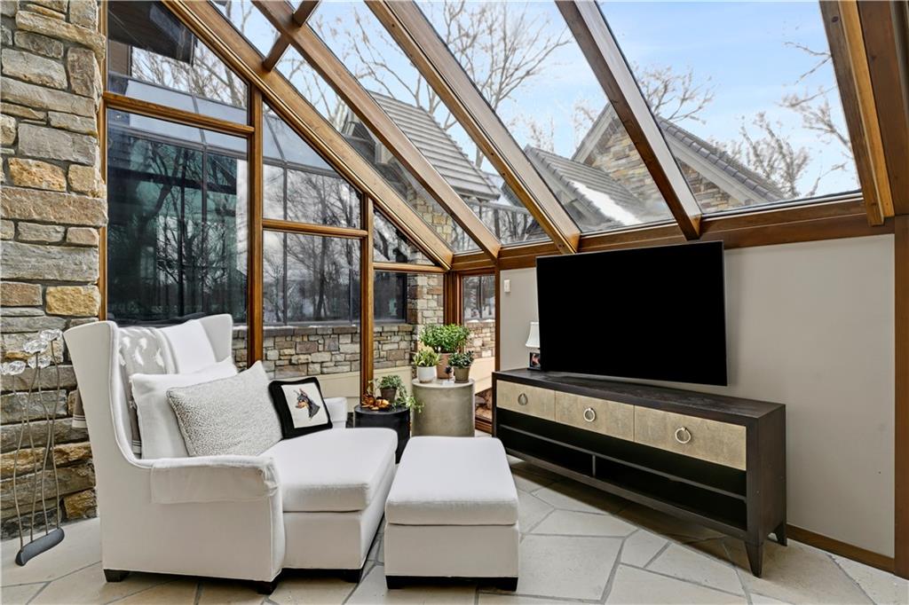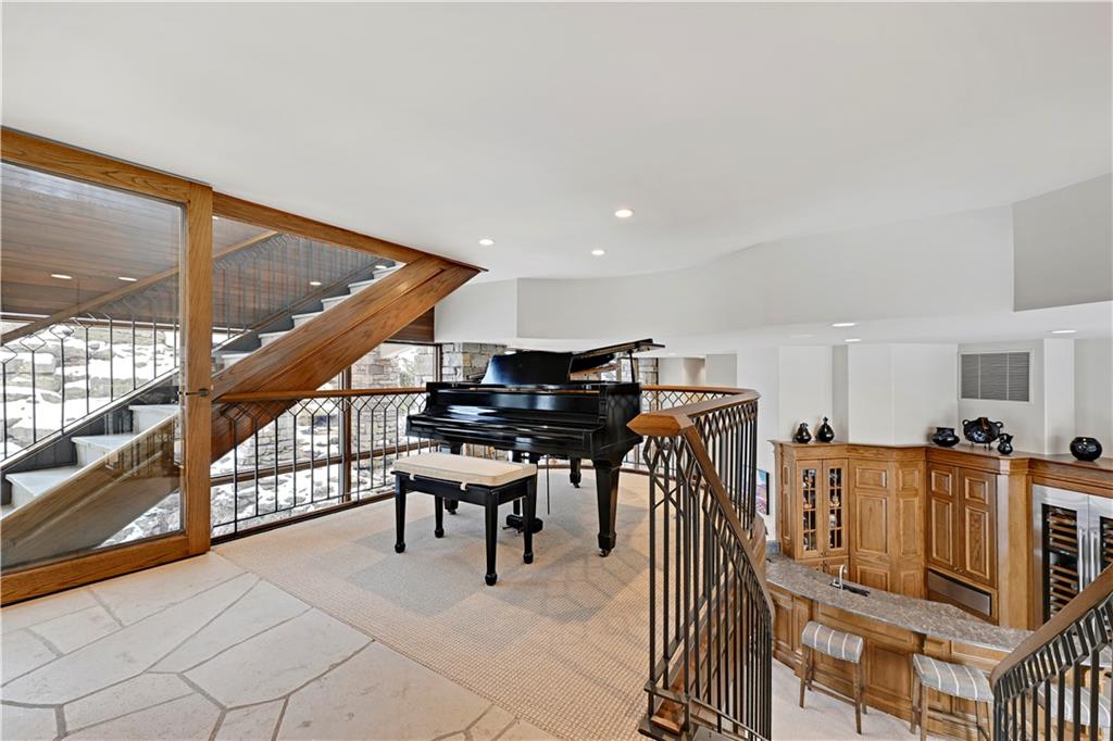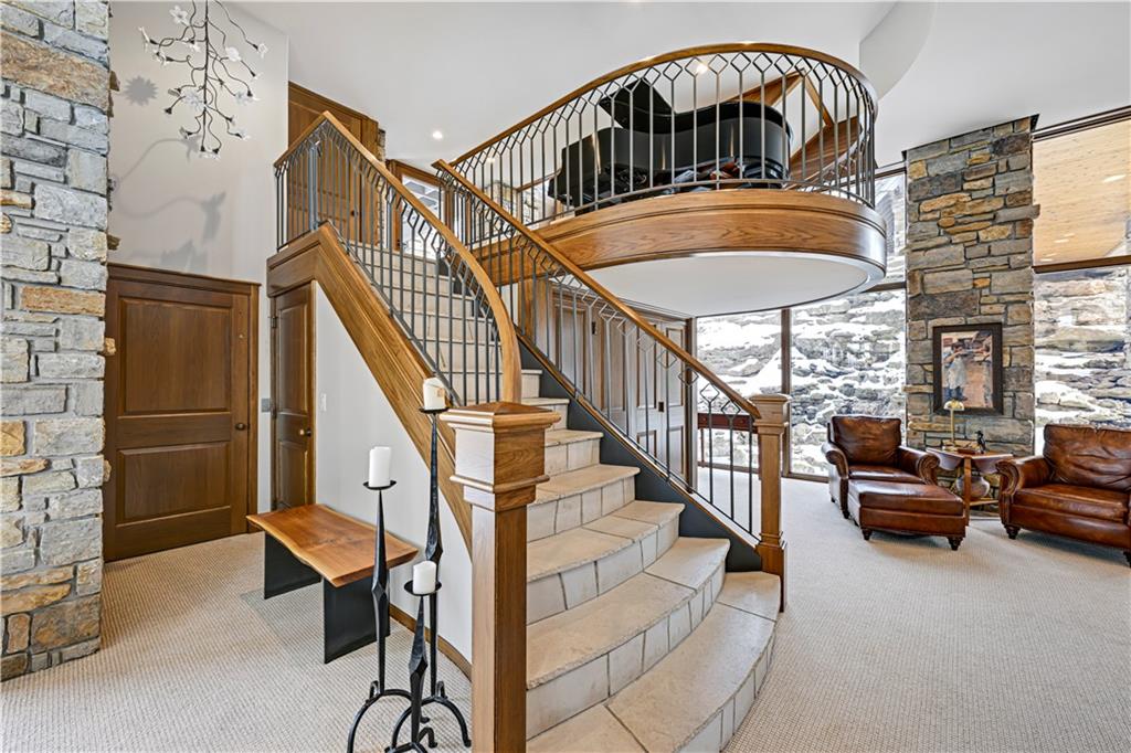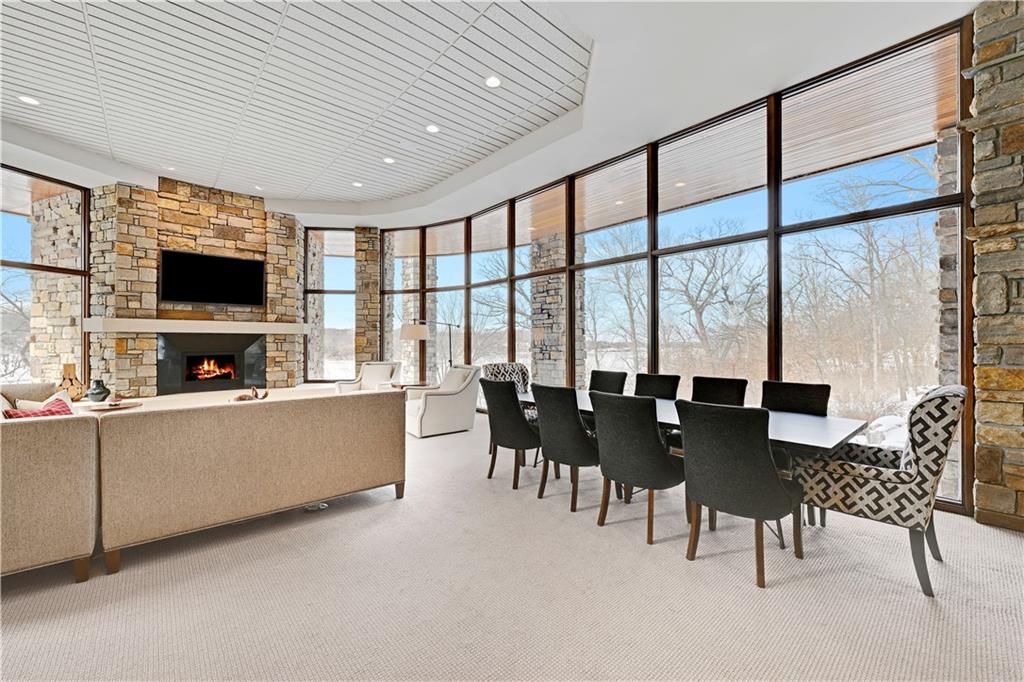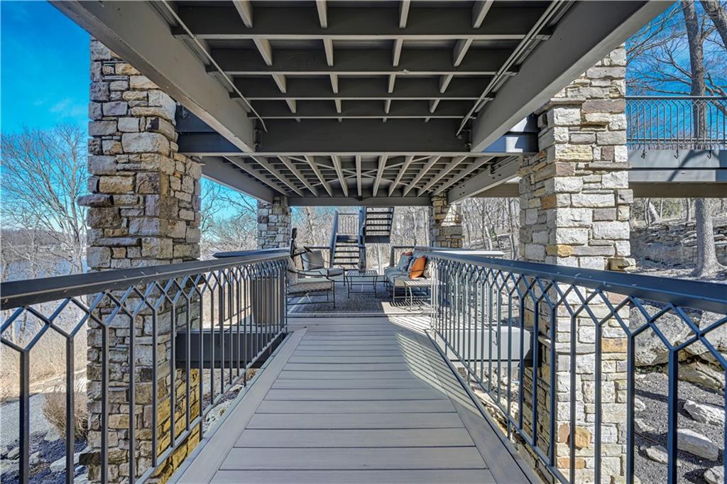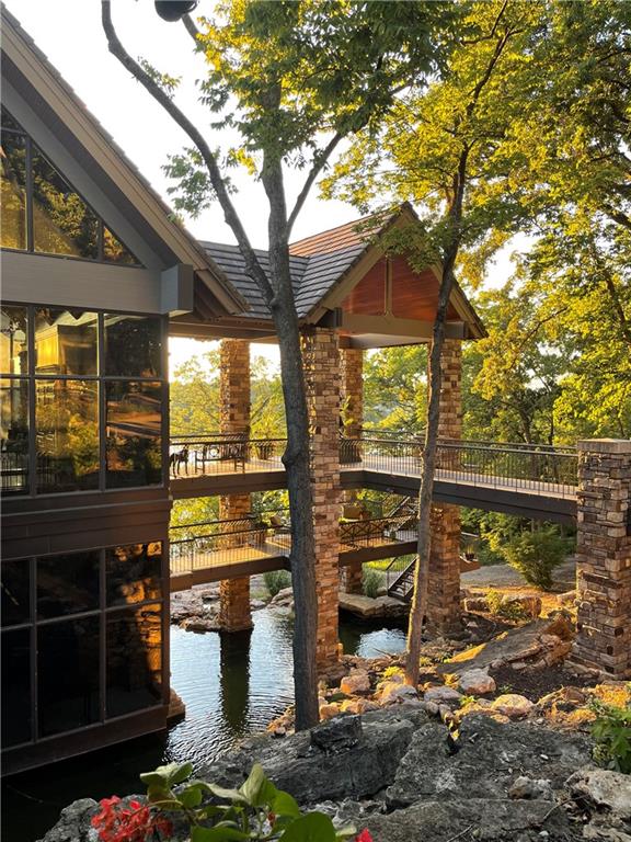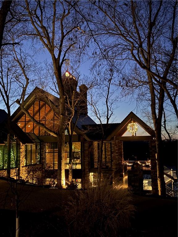 An architectural masterpiece rising from the shoreline, this iconic Loch Lloyd estate expertly fuses glass and stone to create the stunning effect of living within the landscape itself. The great room is a true "wow", anchored by a monumental, two-story stone fireplace and a soaring wood-plank cathedral ceiling. Tucked behind this massive hearth is a secret: a spiral staircase that climbs through the stone to a glass-walled lookout tower, and up even further to a deck atop the home, offering the most exclusive lake views in the community. Every level is designed to invite the outside in with walls of glass on all sides.The kitchen, featuring a secondary butler’s kitchen and seamlessly open to the great room, serves as the central hub for entertaining on the main level. The primary suite includes heated floors and a private loft. The primary bath is a serene spa-like setting with heated floors, dual vanities, a soaring vaulted ceiling, and separate tub and shower. The walk-out lower level is built for grand-scale hosting, centered around a massive family room with a fireplace, full bar and a full second kitchen. A passenger elevator offers ease of movement for people and entertaining equipment. This level also includes four additional bedrooms, two baths, and a second laundry room with dog wash station. Step down to a second lower level which features a large media/rec room plus a massage room for ultimate wellness. The grounds are a sensory and entertaining masterpiece with five tiered decks, an outdoor kitchen, firepit, cascading waterfall spilling into a koi ponds and custom outdoor art works scattered throughout the incredibly landscaped and wooded 2.5 acres. Despite the wow factor of the home, practicality abounds with features including a whole-house generator, new tile roof, and a 4-car garage. A rare fusion of nature and sophisticated design, every season is a new delight in this landmark home!