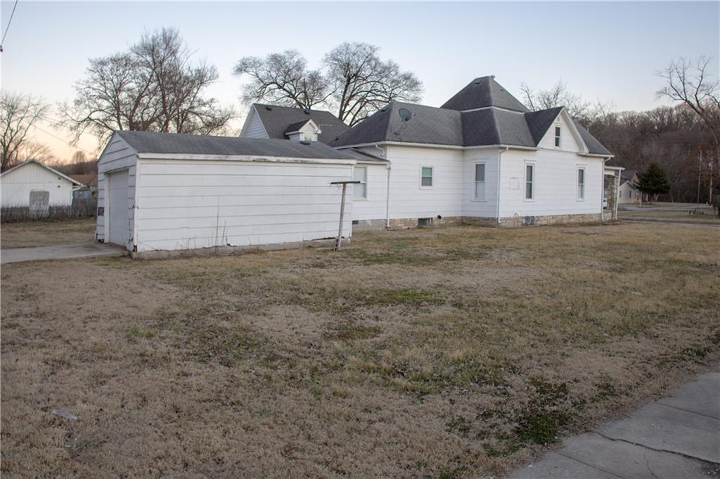 Charming 3-bedroom, 1-bath bungalow situated on a spacious double lot in a prime downtown location! This home features a welcoming front porch with classic stone columns, perfect for relaxing evenings. Inside you’ll find beautiful hardwood floors and timeless character throughout. The detached garage provides additional storage or workshop space. Upstairs offers incredible potential with sheetrock already completed — allowing for an additional 400–500 square feet of finished living space with just a little more work. Located just steps from the park and walking trails, this home combines location, charm, and opportunity. With a few finishing touches, you can truly make it your own!