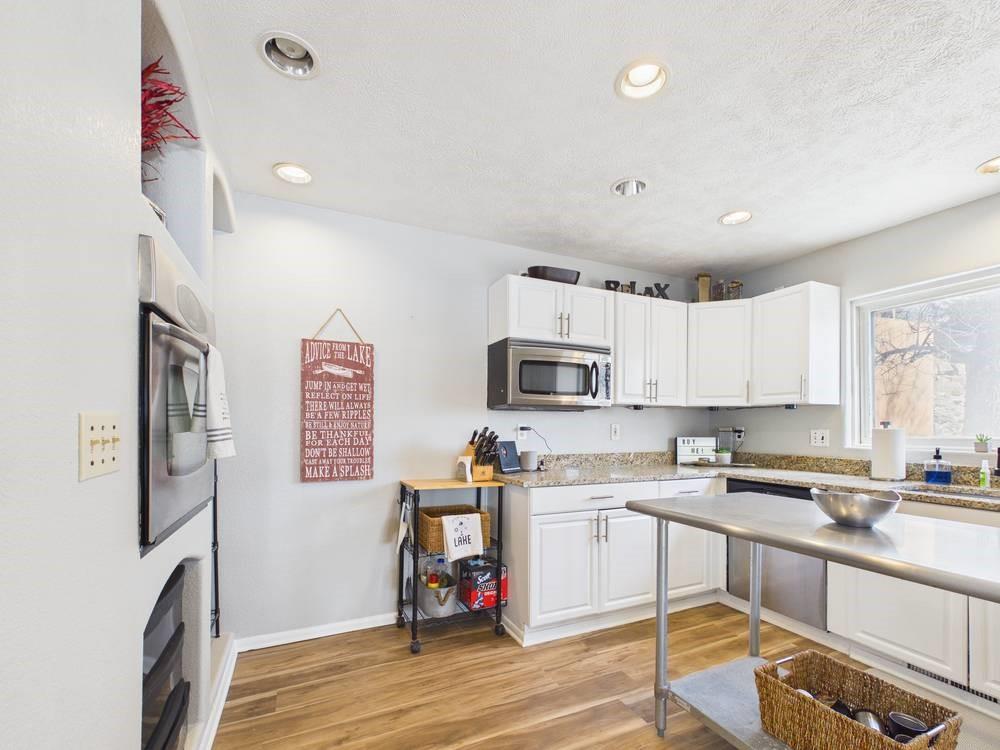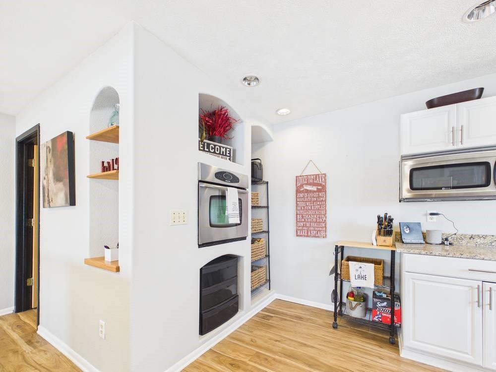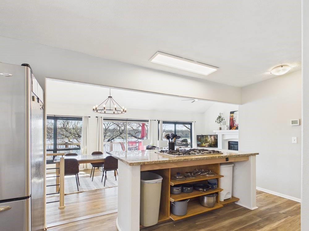 Situated on the tranquil shores of Lake Fort Scott, this fully furnished property features a charming main house and a separate recreation building, ideal for hosting guests and enjoying leisure time. The main house boasts three bedrooms and two-and-a-half bathrooms. Spanning three levels, the residence features a bright and airy open floor plan on the main level, highlighted by vaulted ceilings and modern stainless steel appliances in the kitchen. The expansive deck provides ample space for outdoor gatherings, while the lower-level covered patio serves as an additional entertainment area, ideal for relaxing by the lake. The separate recreation building enhances the property with an entertainment area, complete with a full bath, wet bar, sleeping area, and dining space, making it an excellent retreat for relaxation or entertaining. Additional perks include two storage sheds for convenience and a private boat dock complete with a lift, making it a perfect retreat just an hour and 15 minutes from the Kansas City area. Enjoy lakeside living at its finest! The exterior of the main house has just been completely repainted with wood repair and interior touch-ups. Lake Fort Scott has a $150 a year lake frontage fee and a monthly sewage bill paid to the city.