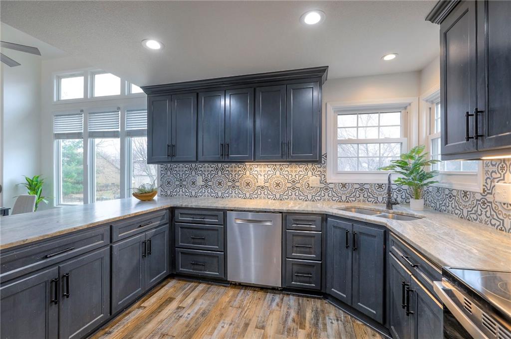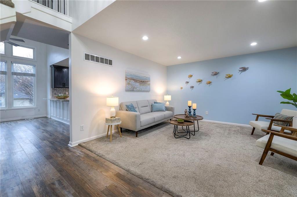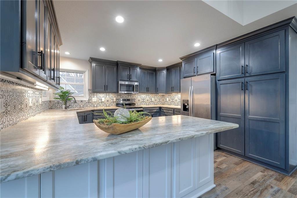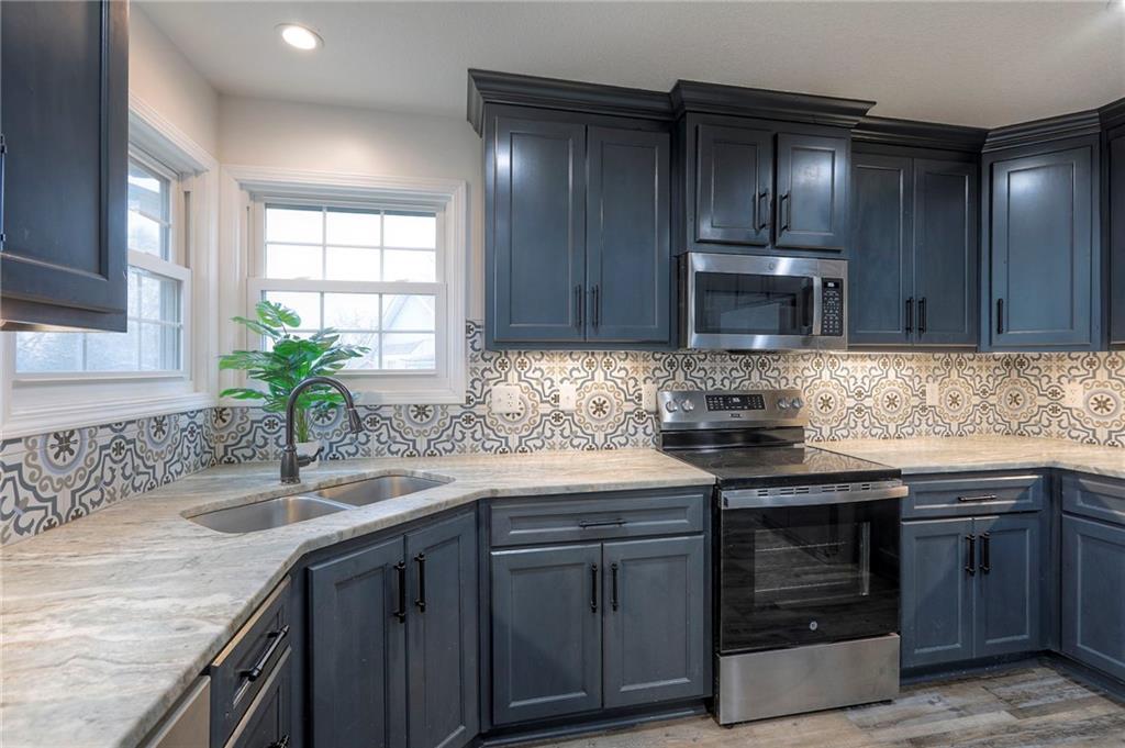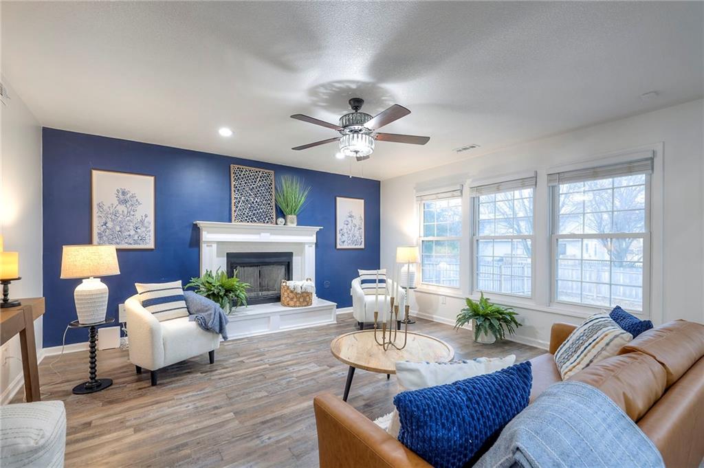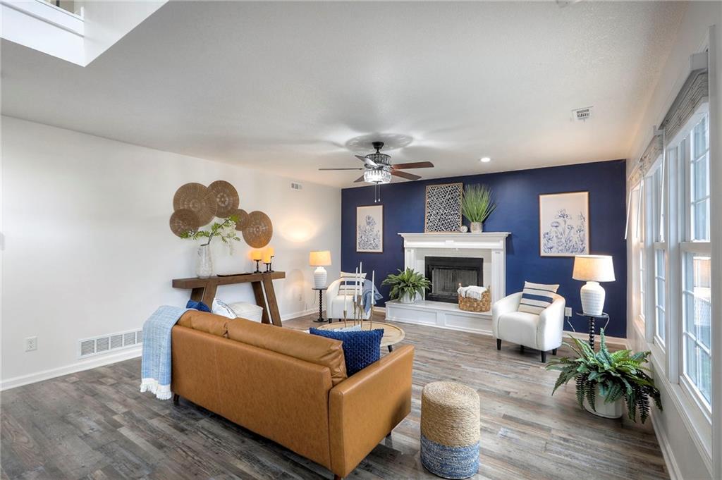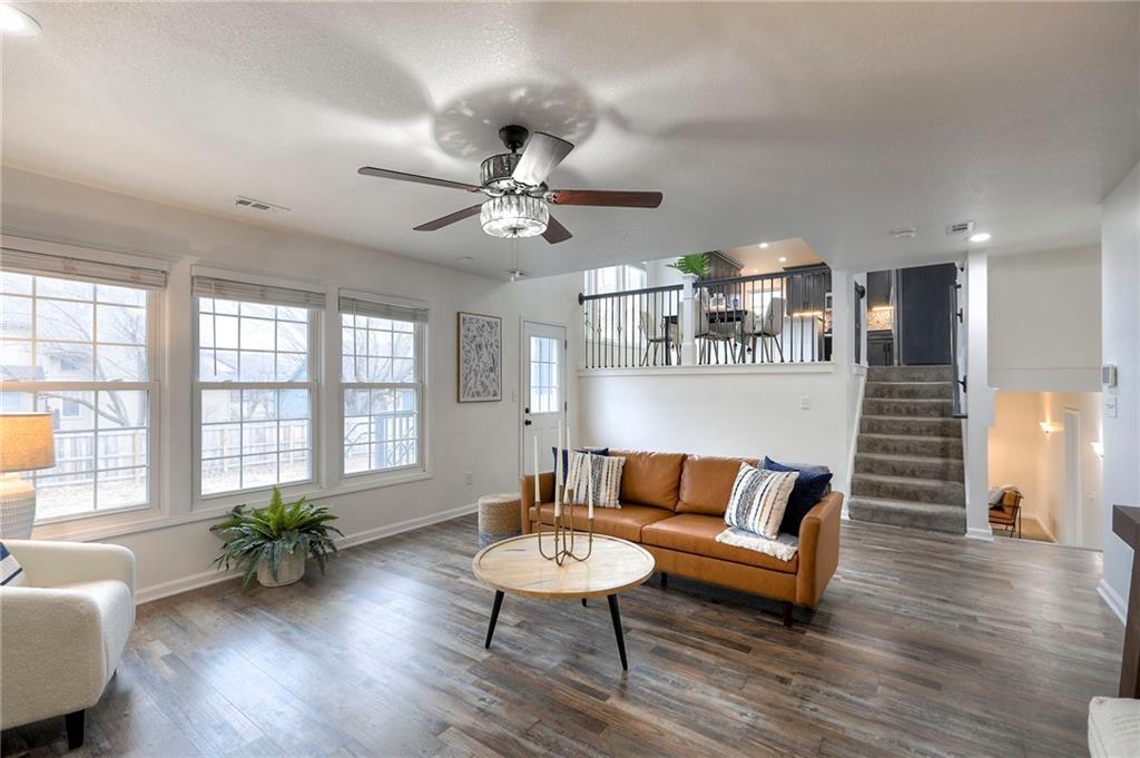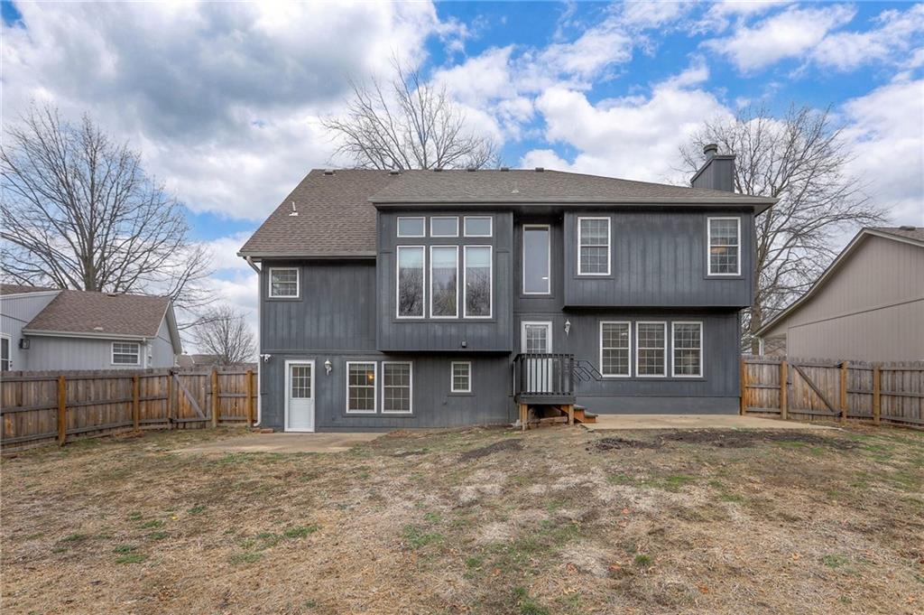 HURRY to view the best value in Lee’s Summit, a stunning, FULLY REBUILT 4-bedroom, 3-bathroom, 2,437 square foot home with modern updates and finishes in quiet Hawk’s Ridge, near the private community POOL! You will be greeted by a stylish exterior, a newer roof, and freshly poured concrete stairs. Step inside to soaring ceilings, fresh paint, and stunning lighting. Off the front entry is an inviting living room. This leads to a gorgeous, OVERSIZED KITCHEN with custom wood cabinetry and ceiling-height cabinetry, built extra-deep for maximum storage. Stainless steel appliances, backsplash, under-cabinet lighting, ample quartz countertops, and Pergo flooring are a chef’s kiss. Enjoy meals in the ample dining room with gorgeous flooring and windows. Entertain in the family room featuring large windows, a beautiful ceiling fan, a gas fireplace with a custom tile surround, and direct access to the large backyard. Up just a few stairs are 3 bedrooms, including the primary suite with double doors, a gas fireplace, an ensuite with dual sinks, a walk-in closet, a soaking tub, and a shower. Two more bedrooms with large windows and ceiling fans, same-level laundry, and a full bath complete this level. The 4th large bedroom or office, along with extra storage, is up a few more stairs. The finished lower level is an ideal additional family room for movie watching or an in-law suite with a WALKOUT and a full bathroom. The fenced yard (fence installed in 2024) features two spacious patios ideal for entertaining or barbecuing. The backyard has been freshly seeded and is the perfect space for gardening, pets, or playtime. With easy highway access, parks (including a dog park), shopping, and award-winning Lee’s Summit schools close by, you will want to VIEW this home today!