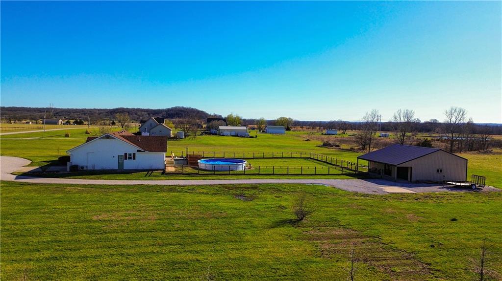 Nestled on 10 picturesque acres just outside of LaCygne, KS, this remarkably well-maintained 3-bedroom, 2-bath home offers the perfect blend of peaceful country living and commuter convenience with easy access to 69 Highway. From the moment you arrive, the picture-perfect exterior sets the tone for what awaits inside. Step into a warm and inviting living room where a stunning fireplace serves as the space's beautiful focal point. The kitchen is designed with functionality in mind, offering abundant cabinetry and storage for all your needs. The spacious primary suite provides a true retreat, complete with a walk-in closet and a brand-new Onyx walk-in shower. The full unfinished basement with a walkout door offers endless possibilities, ideal for additional living space, storage, a workshop, or future expansion. Out back, this property continues to impress with an above-ground pool, hot tub, and deck designed for entertaining and relaxation. Just beyond the fenced yard, you'll find a detached garage with RV hookups, perfect for hobbyists, travelers, or extra storage. If you’ve been dreaming of space, privacy, and move-in-ready comfort, this LaCygne property is one you won’t want to miss.