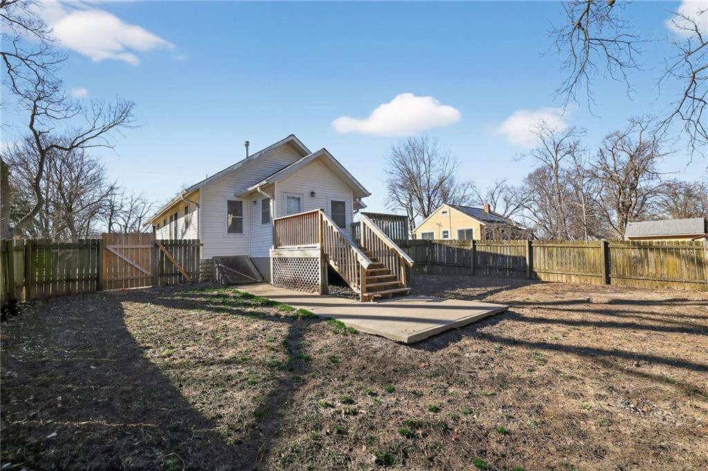 Charming 2-bedroom, 1-bath bungalow in the heart of Raytown offering loads of curb appeal and a warm, inviting feel! Step inside to find neutral colors and abundant natural light that create a bright and airy atmosphere throughout. The dining room flows seamlessly into the living room, giving the home a spacious, open feel perfect for everyday living and entertaining. Both bedrooms feature comfortable carpeting and ceiling fans for added comfort. The kitchen offers convenient access to a large laundry room, providing extra storage and functionality. Enjoy outdoor living on the wood deck overlooking a large lot just shy of 1 acre — plenty of space for gardening, pets, play, or future possibilities. The wood privacy fence adds seclusion and charm, making the backyard your own private retreat. This delightful bungalow combines character, comfort, and space — don’t miss your opportunity to call it home!