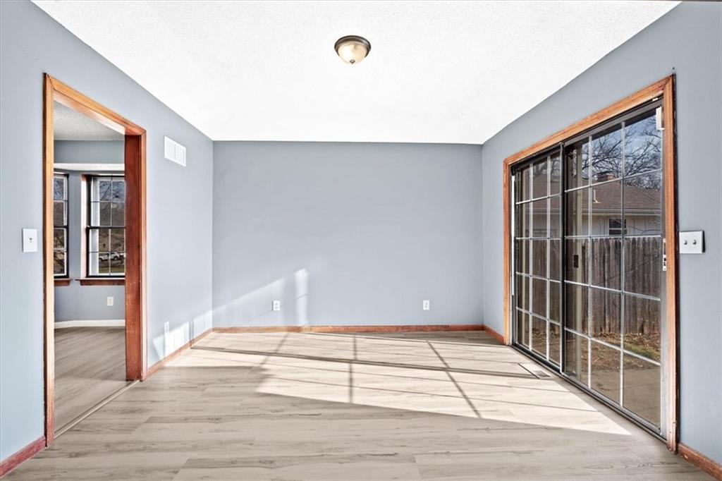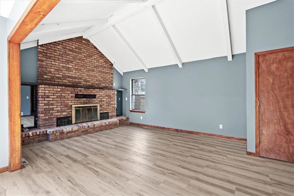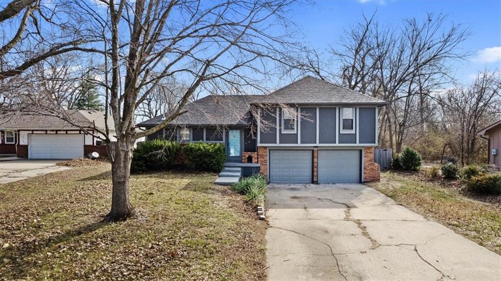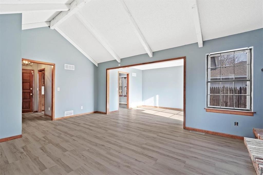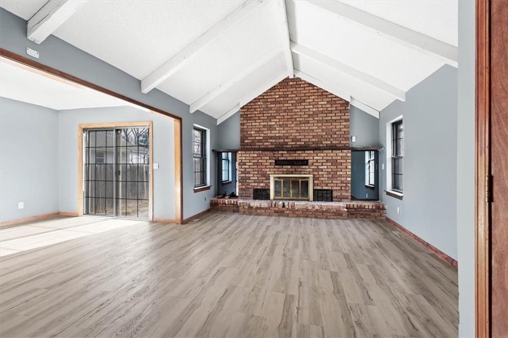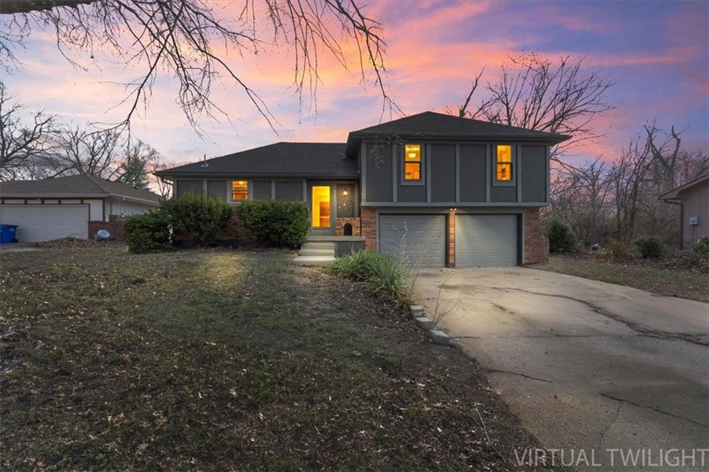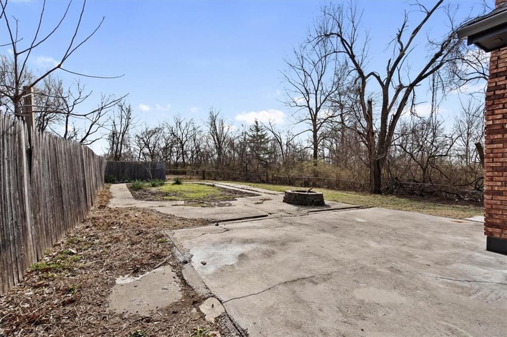 Fully updated and move-in ready, this Raytown side-split checks a lot of boxes, including one you rarely see at this price point: nearly half an acre of land. The oversized lot stretches well behind the home, giving you room to garden, play, entertain, or just breathe. Inside, the updates are everywhere. Brand new roof and gutters (2026), fresh interior and exterior paint, and new luxury vinyl plank flooring flows through the main living areas, kitchen, and entryway. The living room makes an impression with its vaulted, beamed ceiling, floor-to-ceiling brick fireplace, and a sliding glass door that opens to the back patio. The kitchen is spacious and functional, featuring solid oak cabinetry with real character, new granite countertops, updated fixtures, and plenty of room for a full dining setup. The primary suite includes a walk-in closet and a private vanity area with granite counters and its own separate shower. The finished basement is the real bonus, fully drywalled with new carpet, recessed lighting, a wood-burning stove on a brick surround, and a brand new half bath. An egress window makes it legally conforming as a fourth bedroom, and a cedar-lined closet adds serious storage. Out back, a concrete patio with a fire pit sits just off the living room, and then the yard just keeps going. Mature trees, room to expand, and privacy that's genuinely rare for this area.