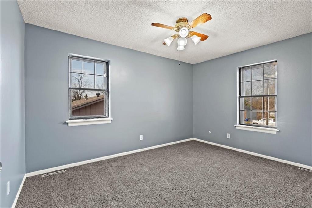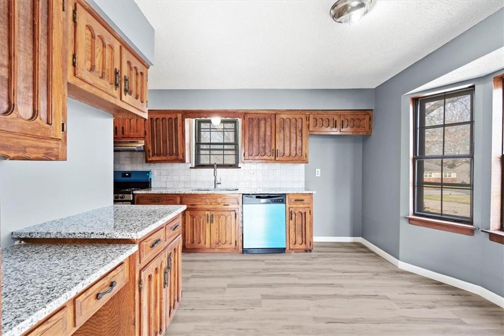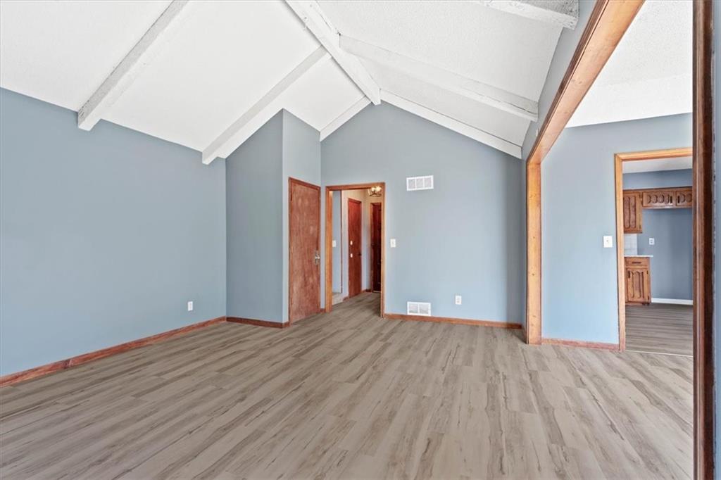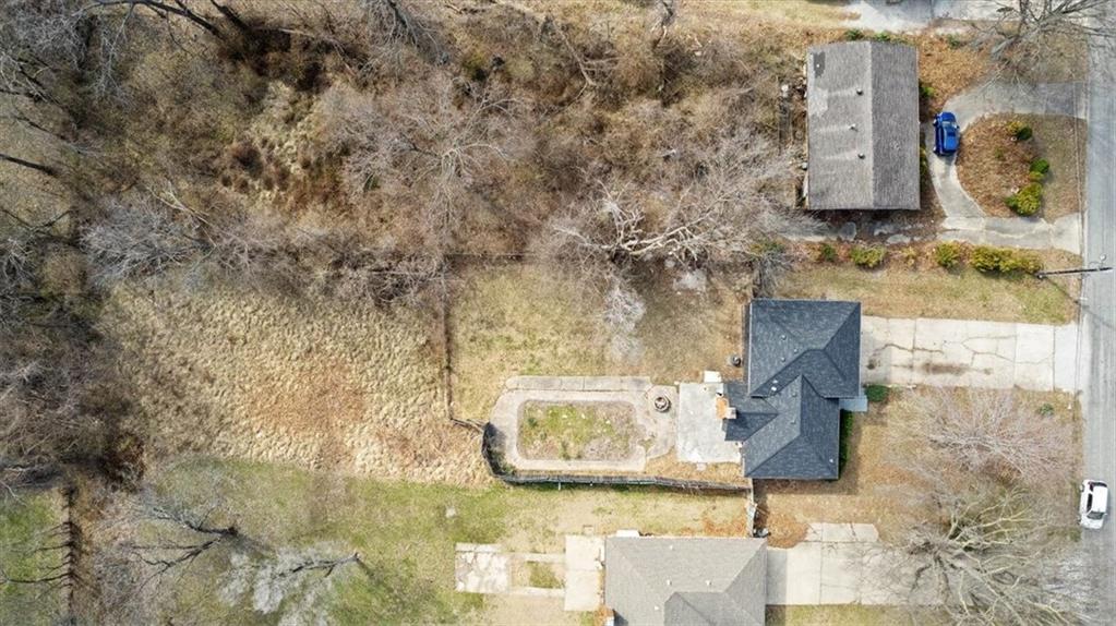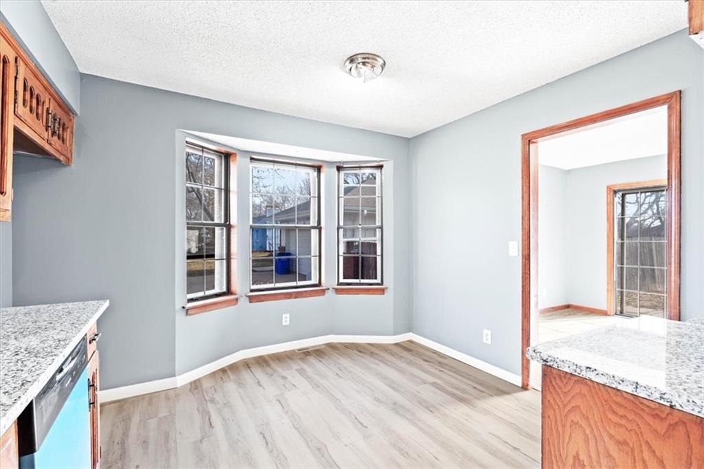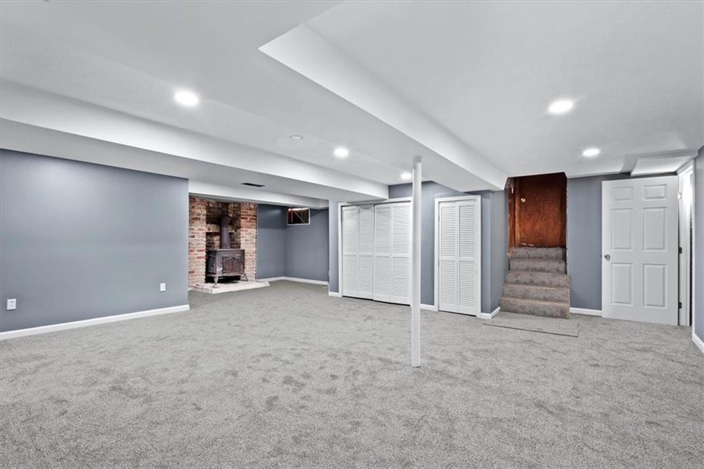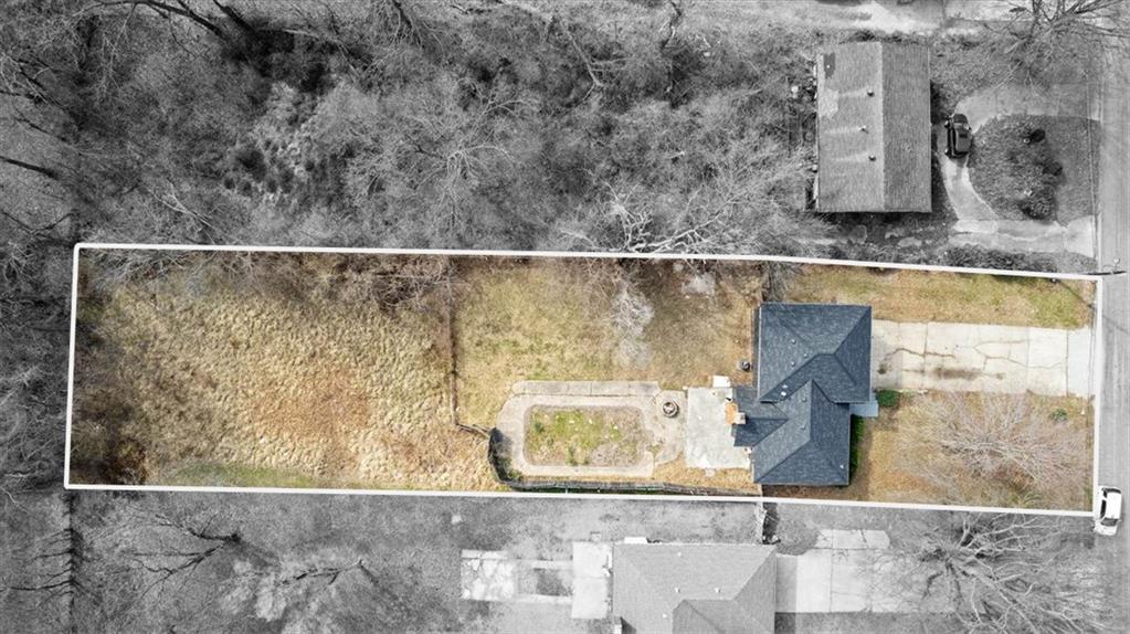 Fully updated and move-in ready, this Raytown side-split checks a lot of boxes, including one you rarely see at this price point: nearly half an acre of land. The oversized lot stretches well behind the home, giving you room to garden, play, entertain, or just breathe. Inside, the updates are everywhere. Brand new roof and gutters (2026), fresh interior and exterior paint, and new luxury vinyl plank flooring flows through the main living areas, kitchen, and entryway. The living room makes an impression with its vaulted, beamed ceiling, floor-to-ceiling brick fireplace, and a sliding glass door that opens to the back patio. The kitchen is spacious and functional, featuring solid oak cabinetry with real character, new granite countertops, updated fixtures, and plenty of room for a full dining setup. The primary suite includes a walk-in closet and a private vanity area with granite counters and its own separate shower. The finished basement is the real bonus, fully drywalled with new carpet, recessed lighting, a wood-burning stove on a brick surround, and a brand new half bath. An egress window makes it legally conforming as a fourth bedroom, and a cedar-lined closet adds serious storage. Out back, a concrete patio with a fire pit sits just off the living room, and then the yard just keeps going. Mature trees, room to expand, and privacy that's genuinely rare for this area.