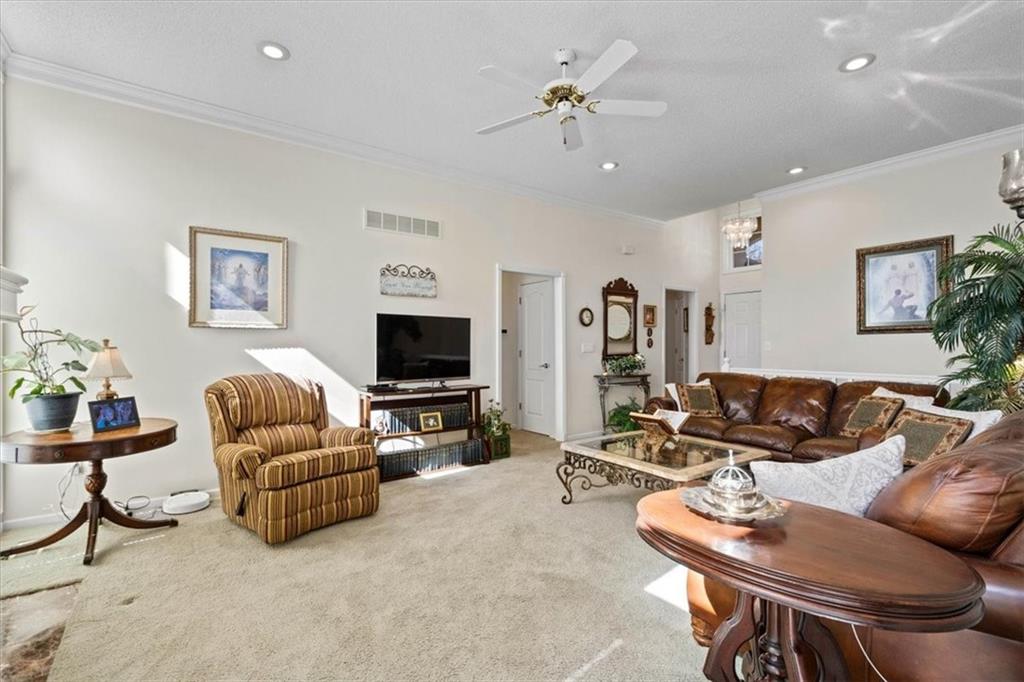 This beautifully maintained ranch in Whispering Meadows offers low maintenance living with convenience to restaurants, shopping, Waterfall Park, and much more! The inviting open floor plan includes a comfortable living room with vaulted ceilings and a gas fireplace as well as the well-appointed kitchen with granite counters and backsplash, custom stained cabinets, and a dining area. The home has 2 large bedrooms which includes the primary bedroom complete with en suite bathroom, walk-in closet, and charming window seat. The unfinished basement provides limitless opportunities from storage to a rec space and more. Whispering Meadows offers a true community environment with a clubhouse, newly renovated pool, and walking trails, plus a packed social calendar with events for a variety of interests, perfect for getting to know your new neighbors!