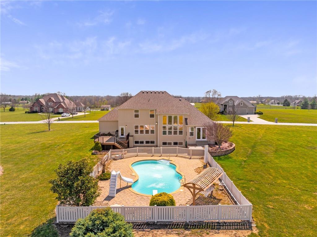 Welcome to your private retreat on 3 acres! This beautiful 1.5-story home features vaulted ceilings, 5 bedrooms, 4.5 bathrooms. The kitchen has been updated with fresh quartz countertops, and the primary suite opens to the four seasons room, perfect for relaxing year-round. The finished basement is set up for entertaining with a theater room and a bar, making it a great space for gatherings, or movie nights. Step outside to enjoy your own backyard oasis featuring a large heated swimming pool and hot tub, all surrounded by the privacy of your 3-acre lot. A 3-car garage completes the home with plenty of space for vehicles and storage. Space, privacy, and great entertaining areas. This one is a must see! The theater seating, basement TV, and downstairs barstools are negotiable and available for purchase.