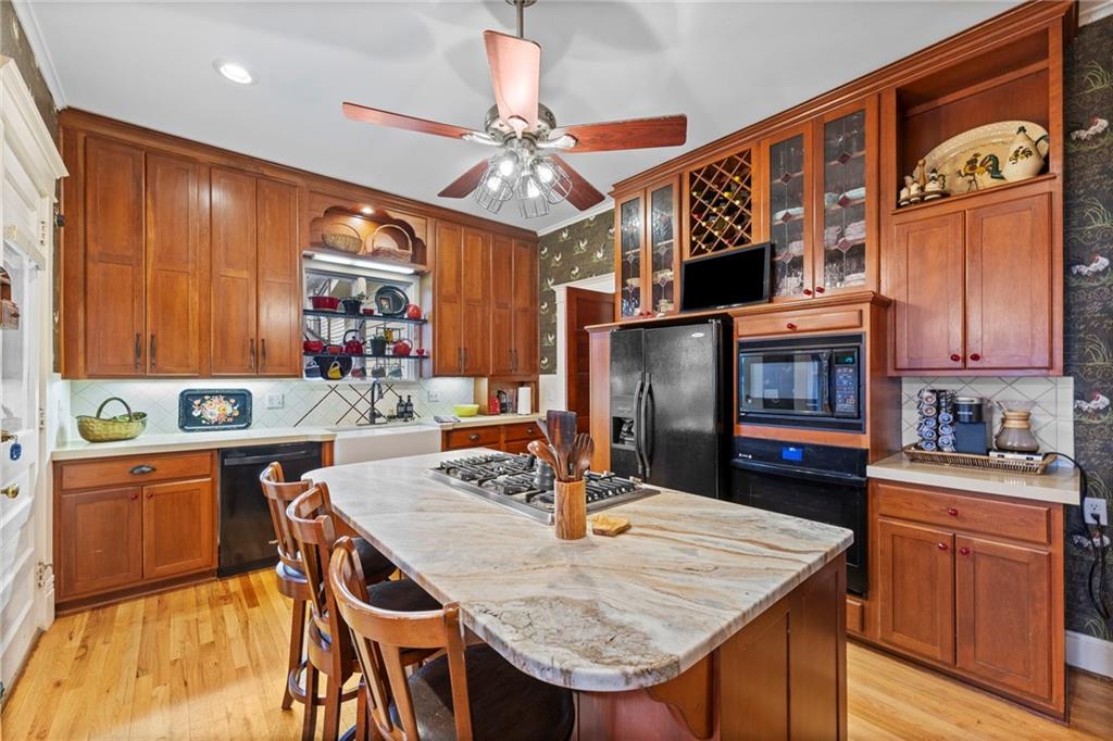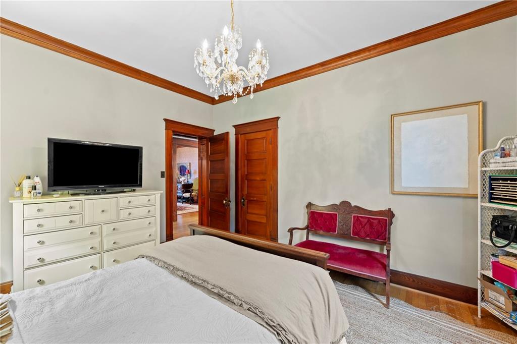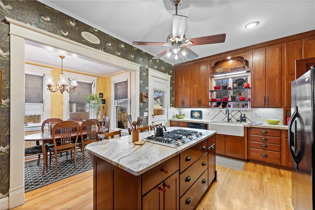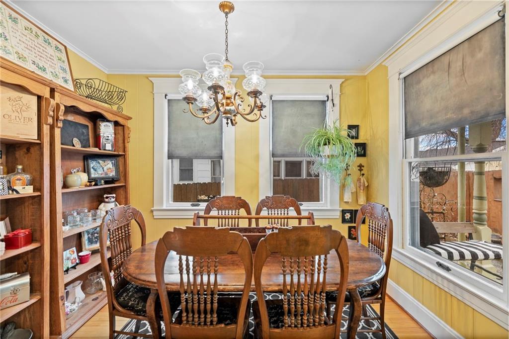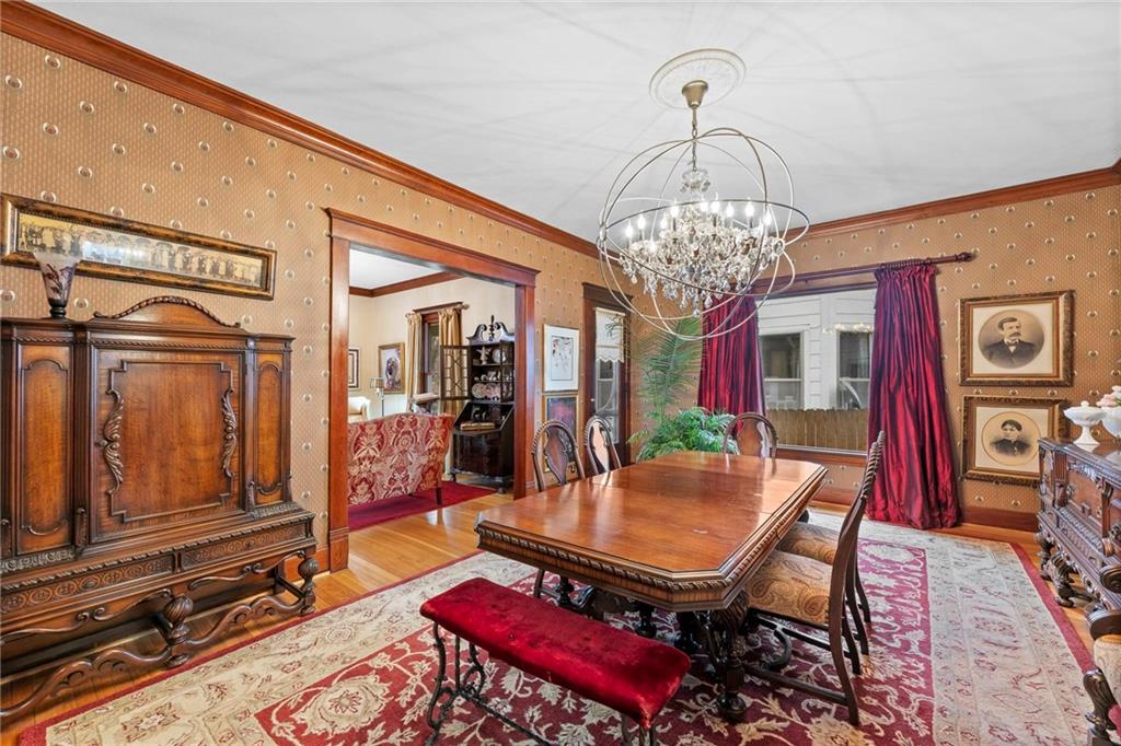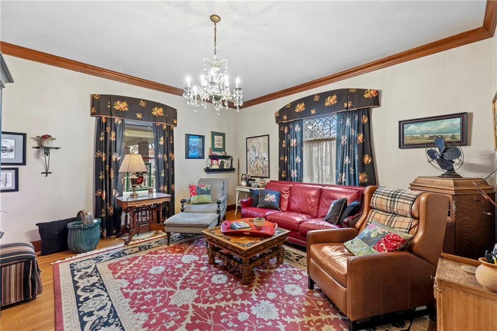 Expect to be impressed as you step into the timeless elegance of the "Washburn" house, a rare residence that masterfully blends old-world charm with sophisticated modern comfort. Meticulously updated while preserving its historic integrity, this home showcases authentic craftsmanship through unique chandeliers, ornate trim, wide crown and baseboard moldings, and original solid wood interior doors. The architectural character shines in the 3 sets of beautiful pocket doors and the lead glass windows that grace the front of the home, while modern peace of mind is provided by newer windows throughout the rest of the house and a central heat and air system installed within the last 5 years. A large, covered front porch invites you into a grand entry room, flanked by an elegant living room featuring an original fireplace and a lovely, sunlit parlor. The gourmet kitchen is a chef's dream, boasting cherry cabinetry, a quartz island, and high-end appliances including a gas stove and a new convection oven with air-frying capabilities. Two butler doors offer seamless flow into the massive formal dining room, perfect for hosting memorable gatherings. The main level features gorgeous hardwood floors and houses 3 spacious bedrooms—including a primary suite —all equipped with walk-in cedar closets and accompanied by 2 full. bathrooms. Upstairs you will find a fourth bedroom, a third bathroom, a cozy den, and a sprawling unfinished area brimming with potential for additional living space. With laundry hookups available on both the main floor and the basement, a detached garage with a finished room above, and a courtyard-style yard ideal for summer barbecues, this property is truly one of a kind. Located within walking distance of the historic Paola square, this home is ready for its next chapter—schedule your private tour today!