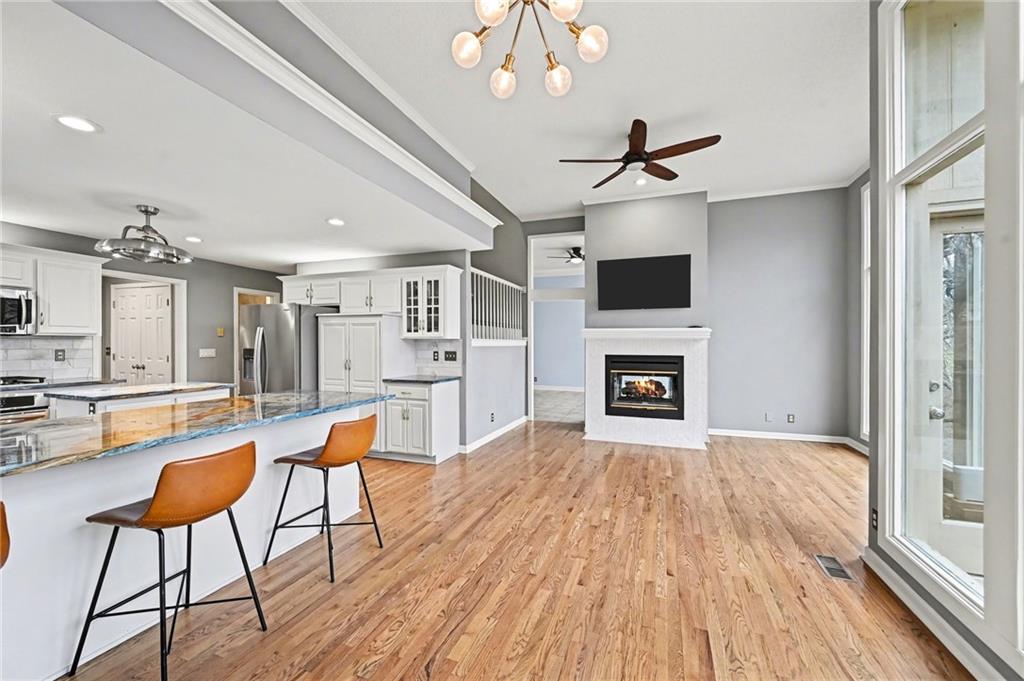 Looking for a 4-bedroom, 4.5-bathroom home in a neighborhood community with amenities? 5529 Sleepy Hollow Drive in Riss Lake Neighborhood is what you've been waiting for! This home is located at the end of a quiet cul-de-sac sitting on a 0.81-acre treed lot with no direct neighbor behind, creating a serene and private backyard setting! Greeted into the home in a foyer open to a home office with French doors, formal dining space, and formal living room with large windows overlooking two levels of decks. An updated kitchen with white cabinetry, granite countertops, & stainless-steel appliances including GE profile gas range & oven, microwave, dishwasher, & fridge. Kitchen open to a hearth room w/ see through fireplace , second dining space, and a cozy sunroom with deck access. Main level primary bedroom w/ dual walk-in closets, a door for deck access, & en-suite w/ dual vanities, separate tub, and walk-in shower. Upper-level hosts 3 additional bedrooms and two full baths. Full finished lower-level w/ second kitchen (granite counters, fridge, dishwasher, stove, & microwave) family room, theater room, & large unfinished space ideal for storage or a workshop area. 3 car garage. Neighborhood amenities include three pools, playground, tennis courts, pickleball courts, basketball courts, walking trails, & private stocked lake. Minutes from shopping, restaurants, schools, and downtown Parkville. OPEN HOUSE 3/7/26 (12:00-2:00 PM) and 3/8/26 (1:00-3:00 PM)